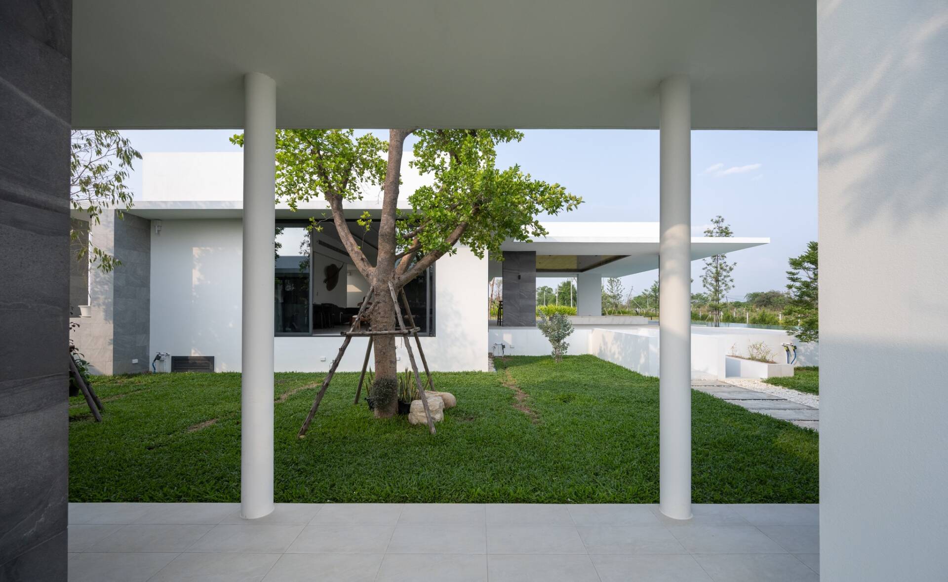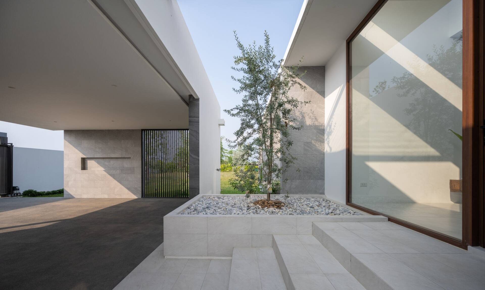 Khoảng sân trung tâm với cây lớn được giữ nguyên vị trí, đóng vai trò như “trái tim xanh” của ngôi nhà. Các cột trắng mảnh nâng đỡ mái đua nhẹ, vừa tạo bóng mát vừa khung lên tầm nhìn thoáng đãng