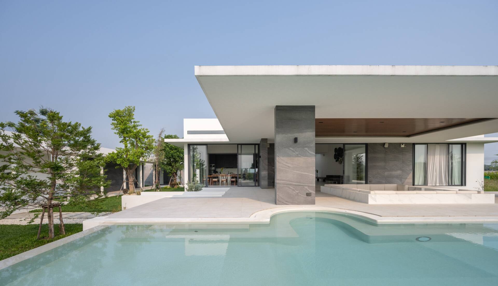 Mái đua rộng, hiên sâu và hồ bơi chạy dọc thân nhà giúp công trình vừa vững chãi, vừa mềm mại. Ở mọi góc nhìn, gia chủ đều có thể cảm nhận được sự tiếp nối giữa kiến trúc và thiên nhiên - giữa tường, nước, ánh sáng và bầu trời. Chính sự phẳng lặng ấy mang lại cảm giác bình yên và dễ chịu, như thể thời gian trôi chậm lại khi bước vào không gian này.
