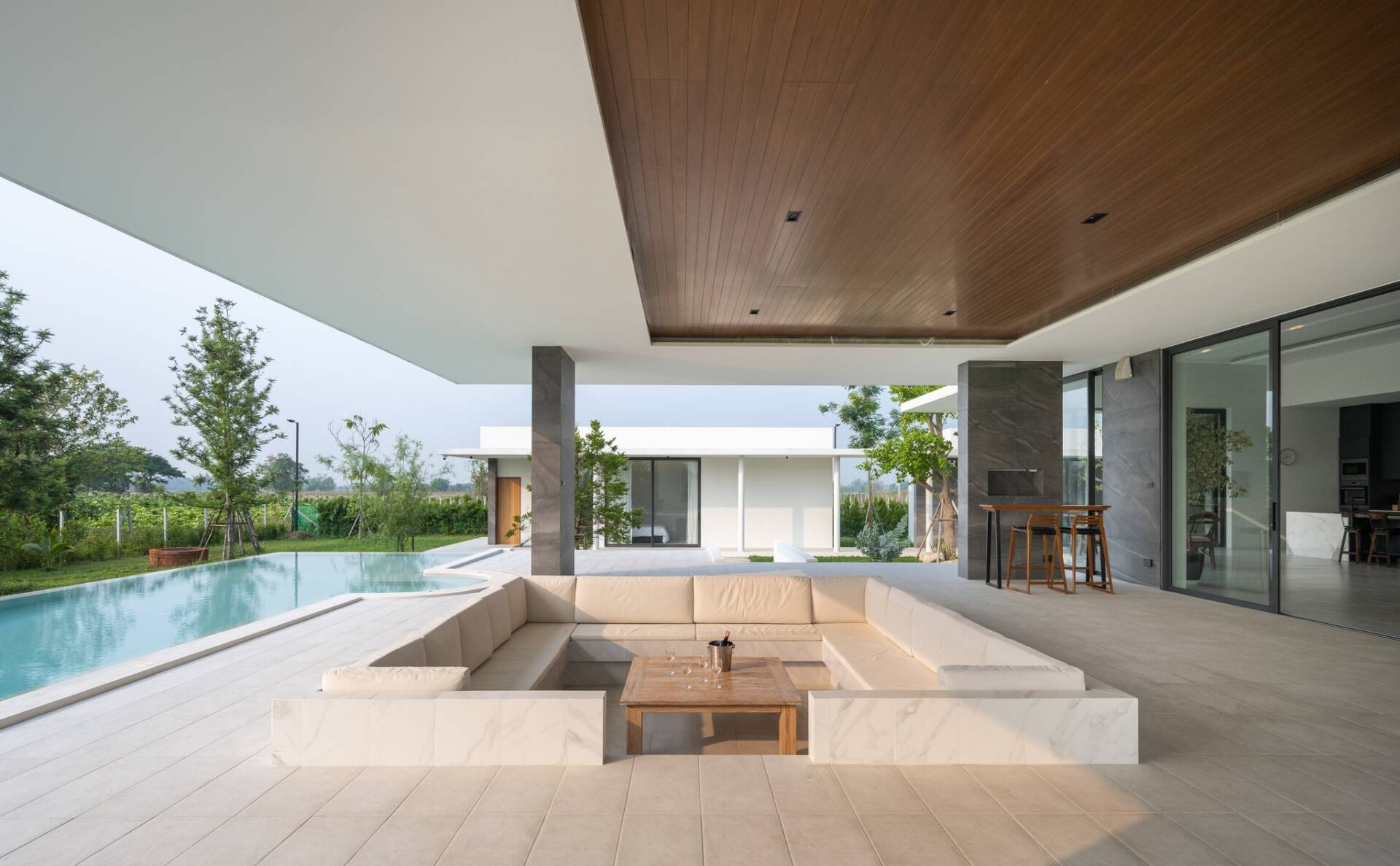 Không gian bán ngoài trời được thiết kế với khu lounge âm sàn nhìn thẳng ra hồ bơi. Giải pháp hạ cốt nền giúp giữ tầm nhìn phẳng, tạo cảm giác thư giãn và kết nối gần hơn với mặt nước