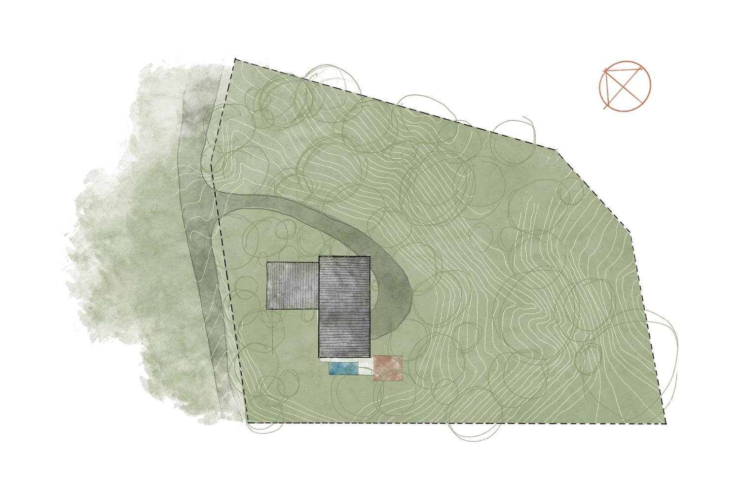 Từ góc nhìn trên cao, ngôi nhà như được phủ xanh bởi thảm cây rừng rậm rạp. Vị trí trên sườn núi cho phép đón trọn ánh hoàng hôn mỗi buổi chiều