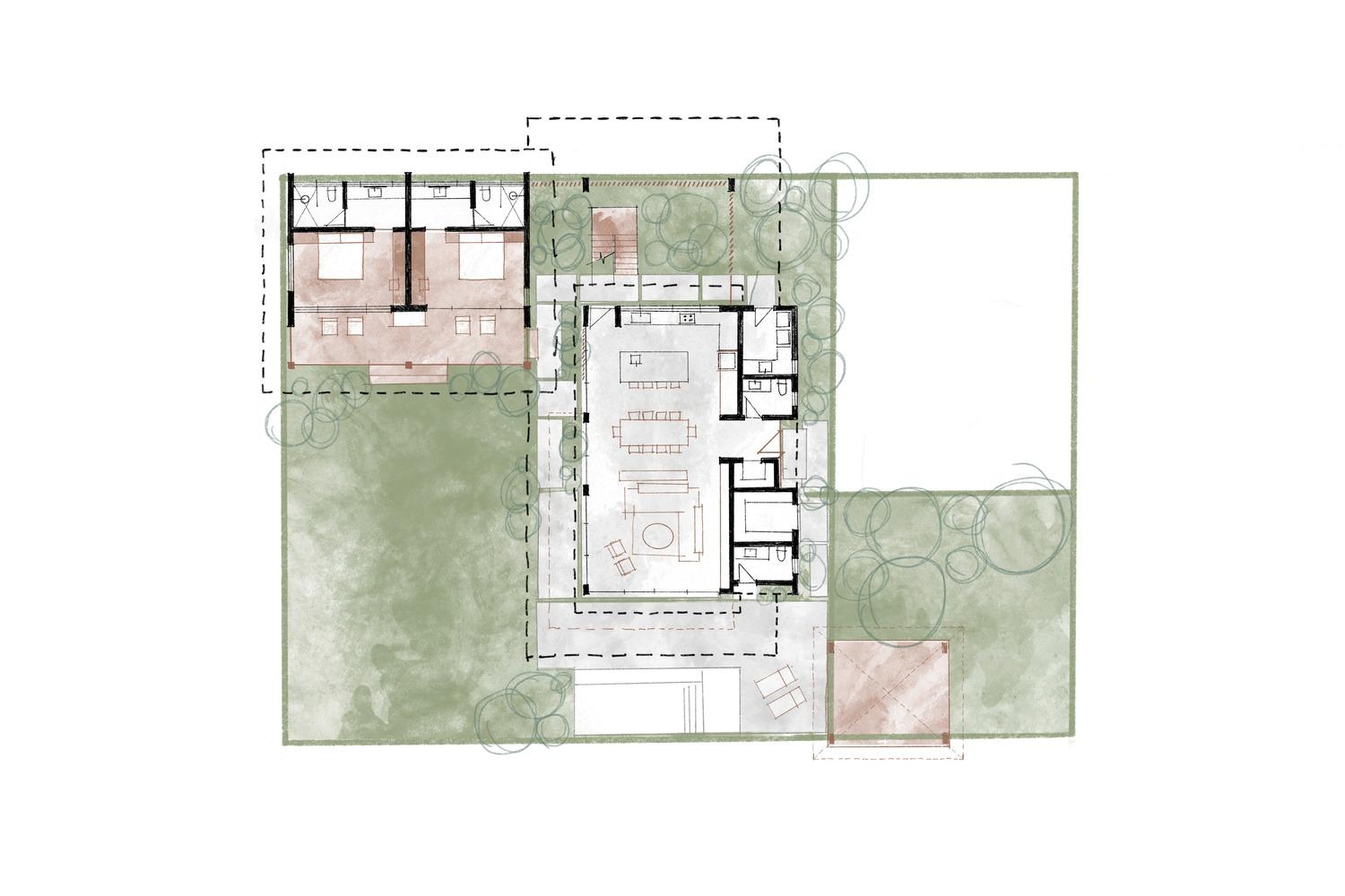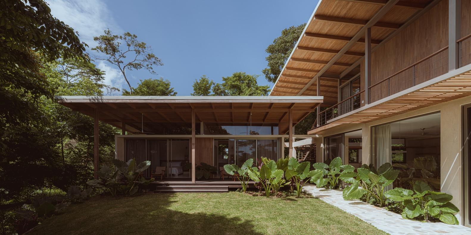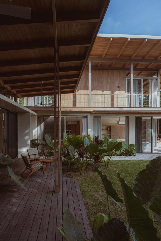 Bố cục chữ L ôm lấy khu vườn trung tâm, tạo cảm giác mở mà vẫn riêng tư. Các khối nhà được liên kết bằng hiên gỗ và hàng hiên dài đón gió