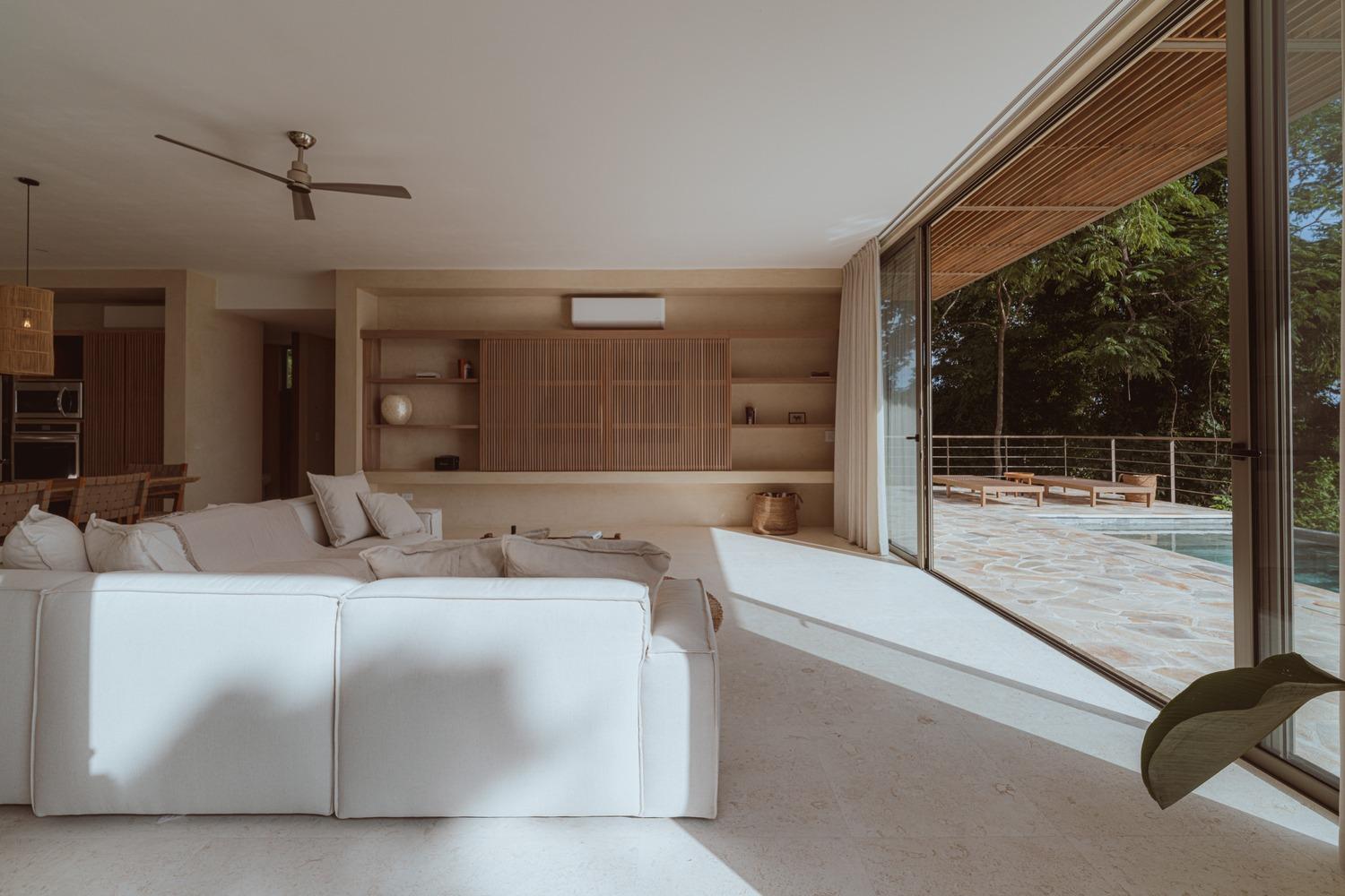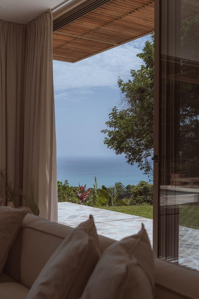 Những khung cửa kính lớn kéo dài từ sàn đến trần mở ra khung cảnh rừng xanh và đại dương xanh thẳm, xoá nhoà ranh giới giữa bên trong và bên ngoài. Tầng trệt là khu vực sinh hoạt chung với phòng khách, bếp, hồ bơi liền kề cùng hai phòng ngủ. Tầng trên dành cho không gian nghỉ ngơi hướng ra biển. Mọi khu vực được kết nối bằng hiên gỗ và mái che vươn dài, tạo cảm giác liền mạch và mềm mại.