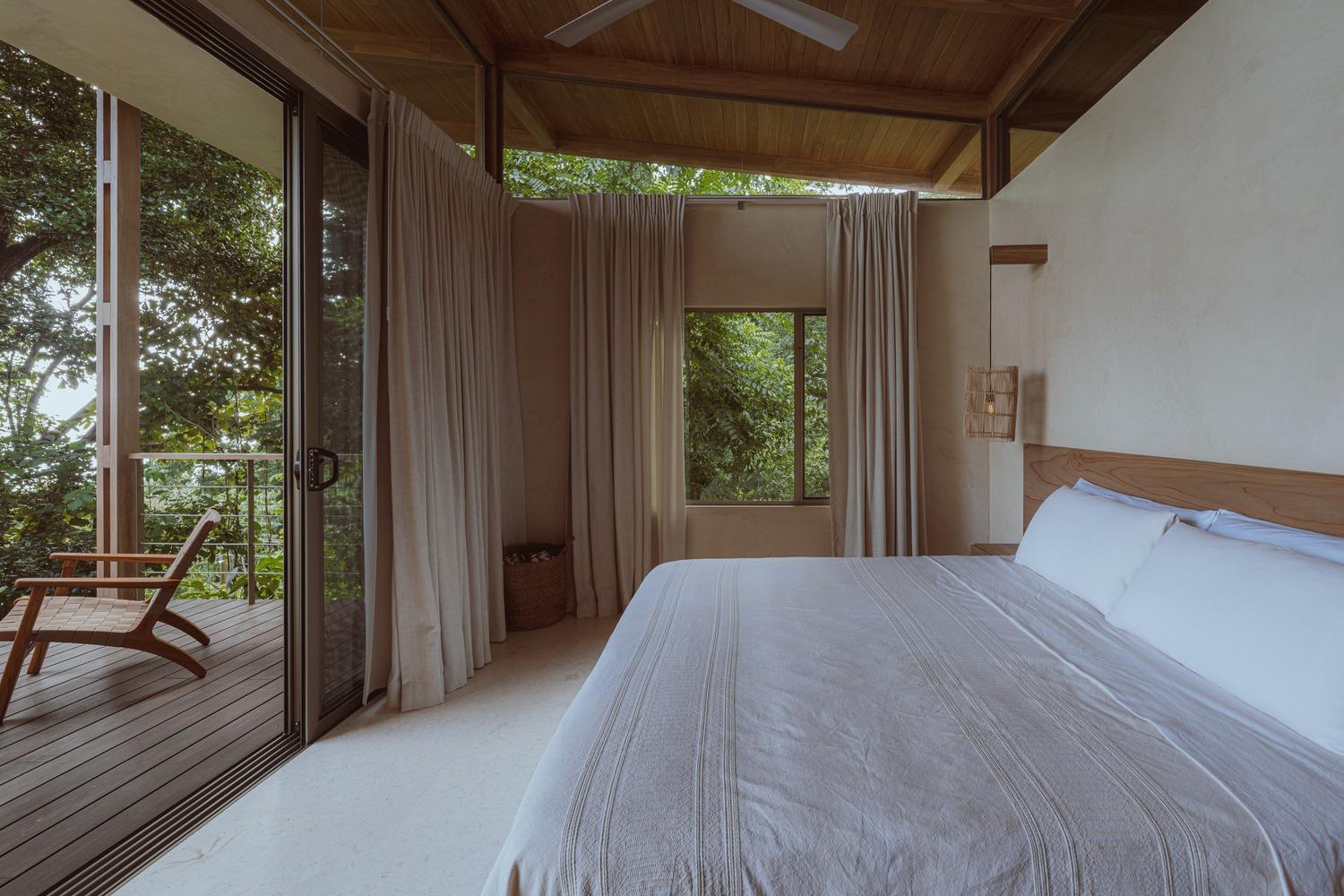 Các phòng ngủ tầng trệt mở thẳng ra hiên gỗ, nơi ánh sáng và gió len lỏi giữa tán lá. Từng món nội thất mộc như ghế đan, bàn tròn gỗ nhỏ khiến không gian thêm ấm cúng