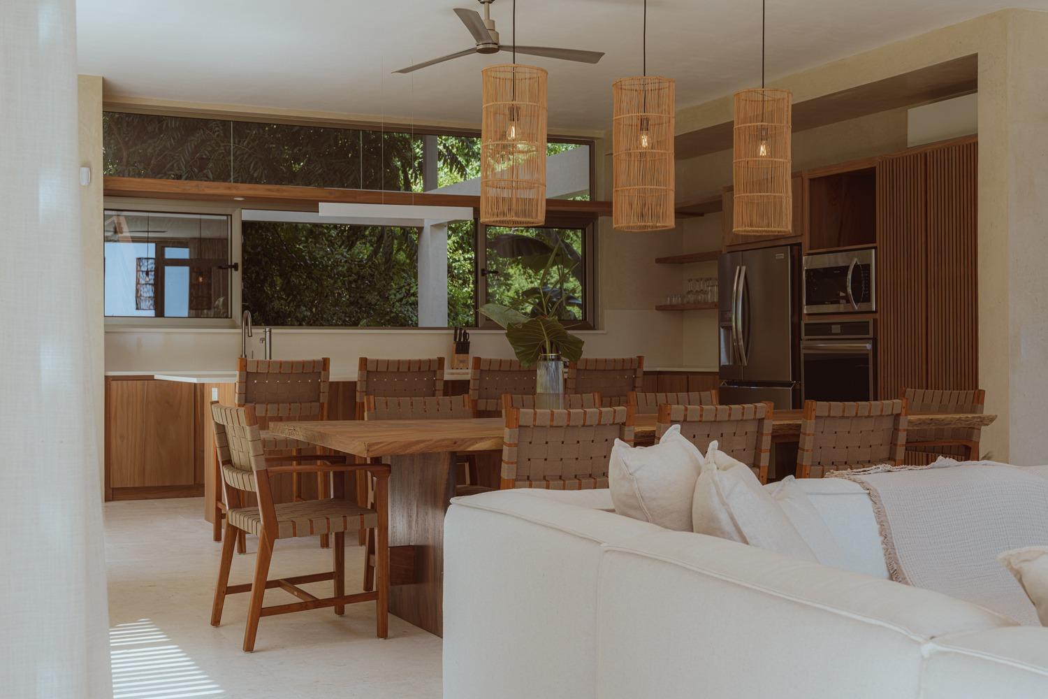 Không gian sinh hoạt chung kết nối bếp, bàn ăn và phòng khách thành một dải liên tục. Toàn bộ nội thất sử dụng gỗ địa phương và tre đan, tôn vinh vẻ đẹp thủ công