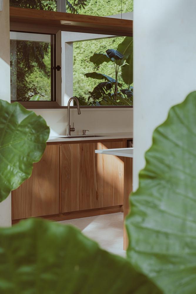 Góc bếp được khéo léo bố trí hướng ra khu vườn xanh mướt. Màu gỗ ấm kết hợp ánh sáng tự nhiên giúp căn bếp trở thành nơi kết nối giữa con người và thiên nhiên