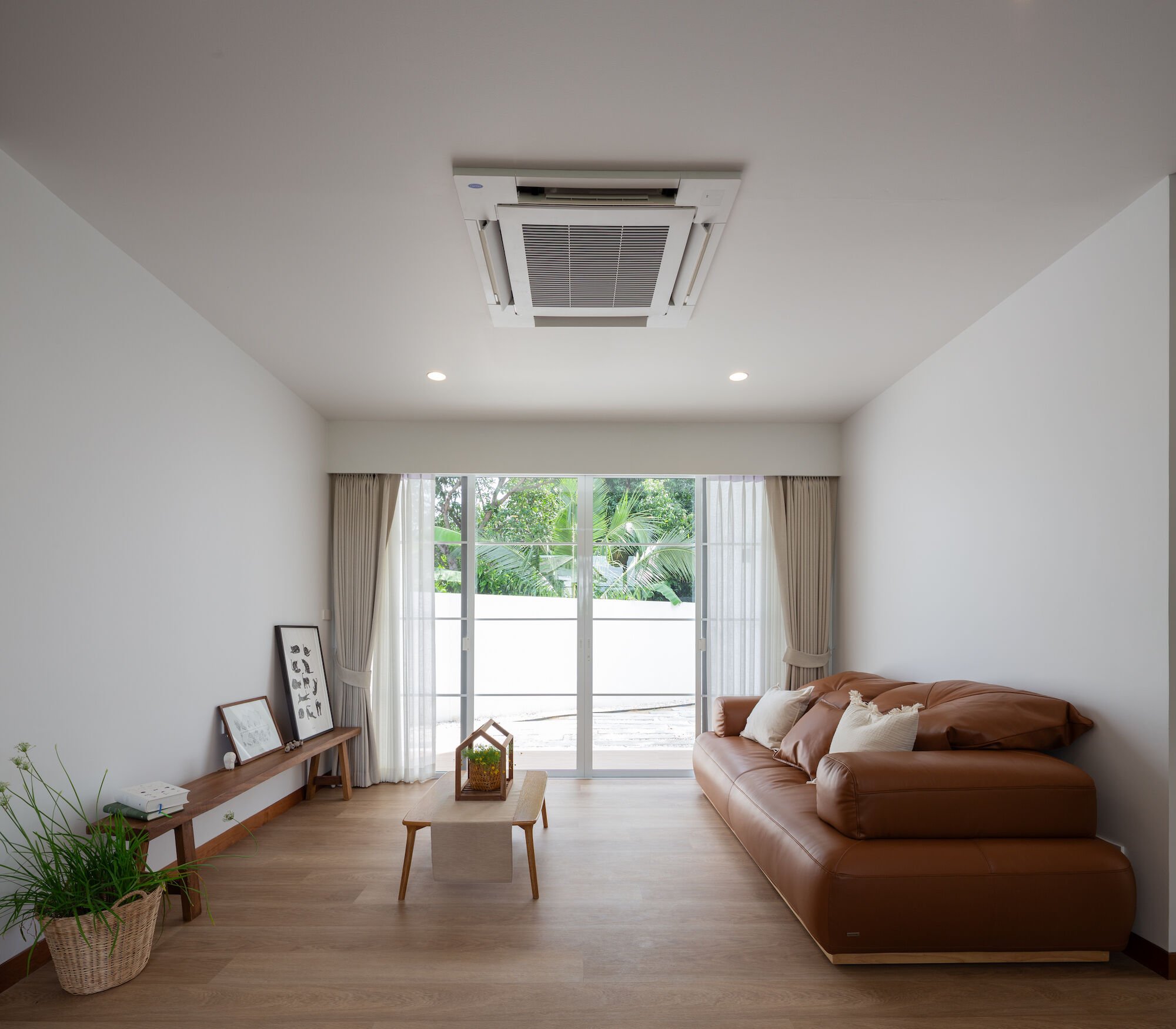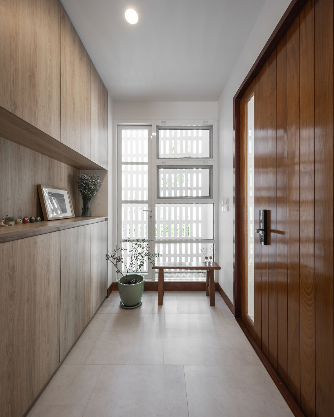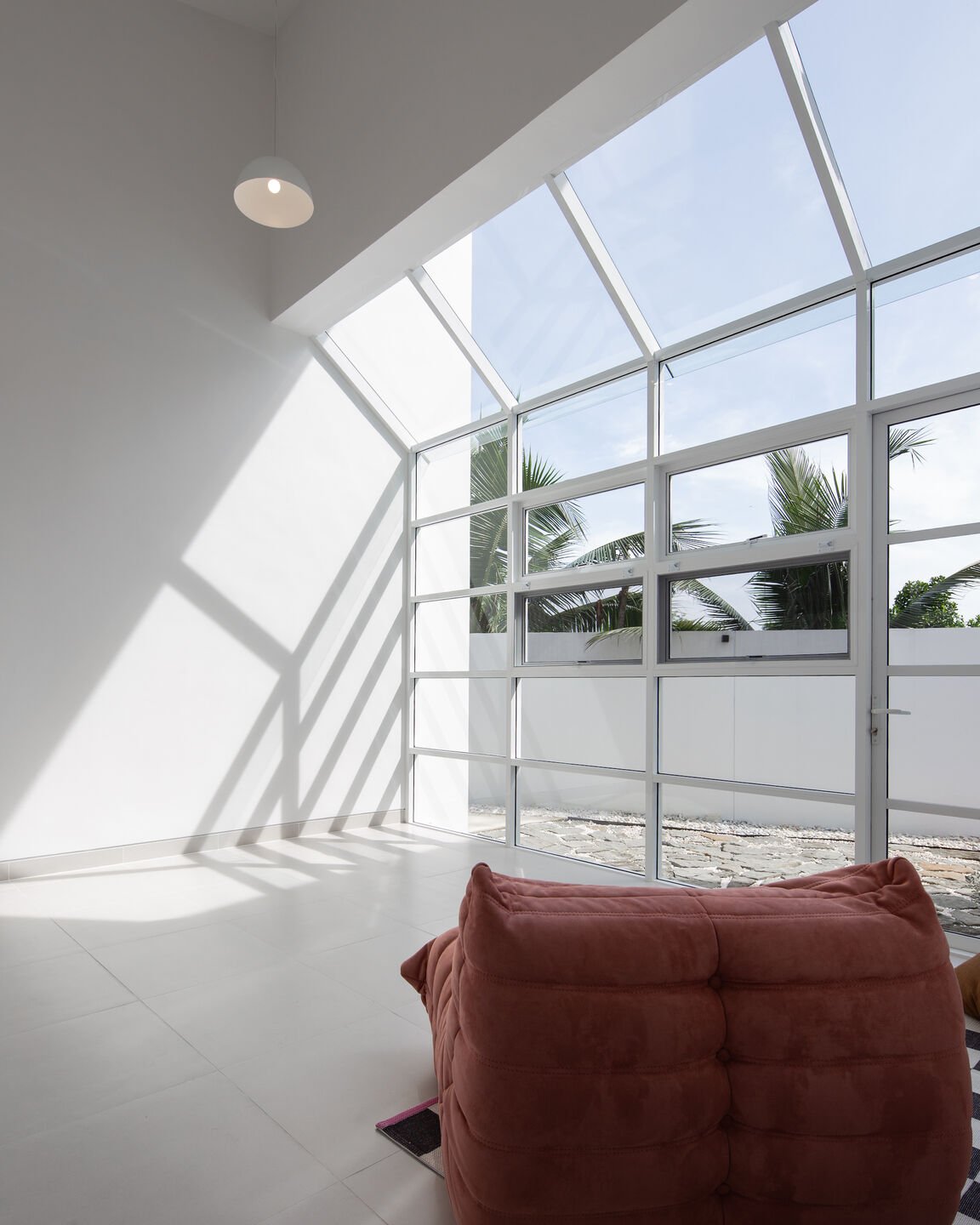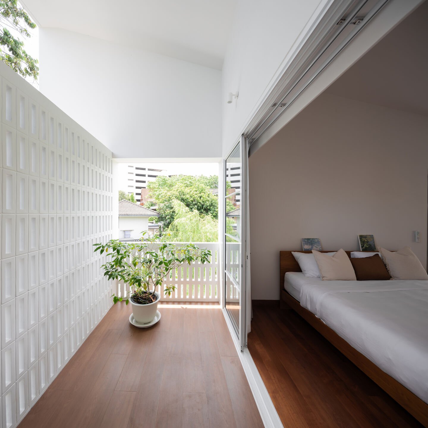Đặc biệt, toàn bộ hệ cửa và cửa sổ của NN House được bố trí hướng Đông Bắc và Tây Nam, tận dụng gió chéo tự nhiên để đảm bảo không khí luôn lưu thông, giúp công trình “thở” quanh năm mà không phụ thuộc hoàn toàn vào điều hòa.