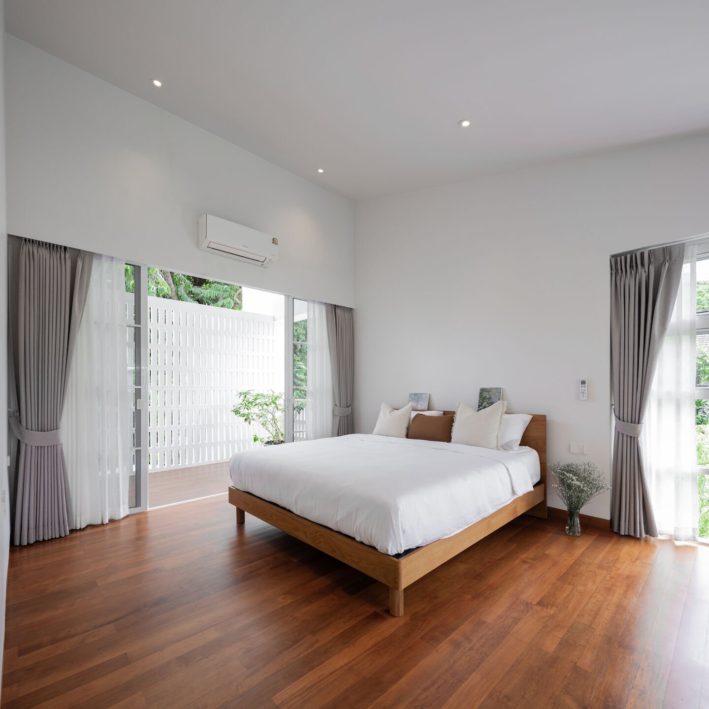 NN House là một ví dụ điển hình cho kiến trúc thích ứng tại vùng ven đô Bangkok – nơi đô thị hóa đang diễn ra nhanh chóng. Công trình được thiết kế nghiêng so với ranh đất để chủ động tránh đối mặt với các công trình lân cận trong tương lai, đồng thời tạo điều kiện lưu thông gió, ánh sáng và tăng cường kết nối thiên nhiên. Với bố cục ba khối chức năng rõ ràng và ngôn ngữ vật liệu bền vững, NN House là một lời đáp thông minh cho nhu cầu sống hiện đại giữa khí hậu nhiệt đới.