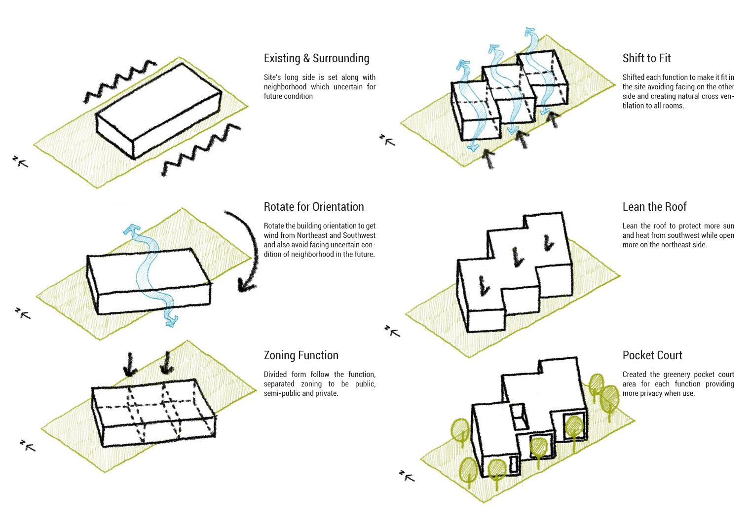 Nhờ cách đặt nhà theo góc chéo, các khoảng sân nhỏhình thành tự nhiên giữa các khối nhà của NN House. Đây là giải pháp quan trọng để thích nghi với đặc điểm khu vực, bao gồm cả khí hậu nhiệt đới và cộng đồng dân cư, cụ thể: