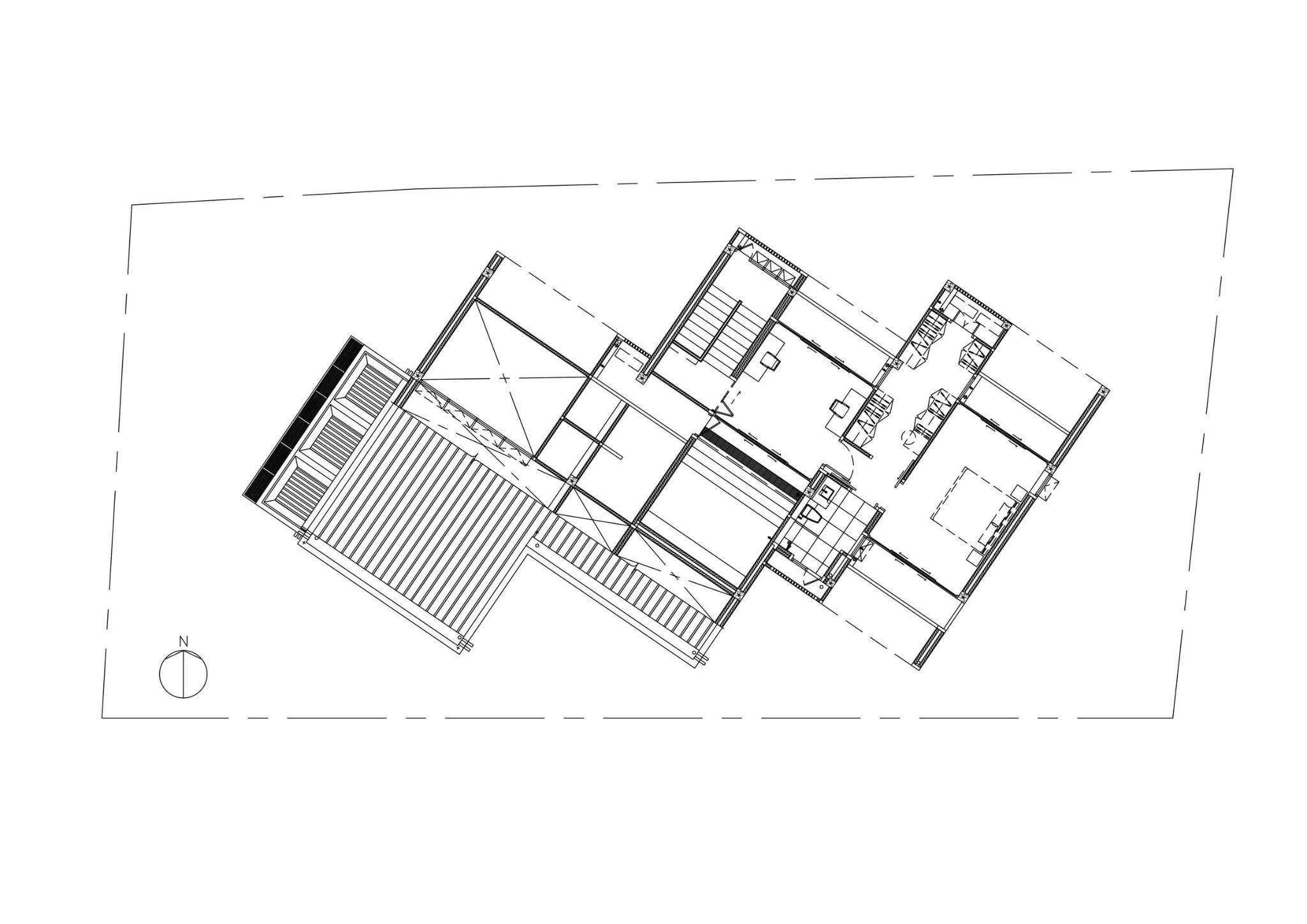 Phía trước nhà là khu để xe và phòng làm việc, vừa tiện cho công việc, vừa tách biệt khỏi khu sinh hoạt chính để đảm bảo sự yên tĩnh. Đây là khối có mái thấp nhất, là vùng bán công cộng, chuyển tiếp nhẹ nhàng giữa ngoài và trong nhà.