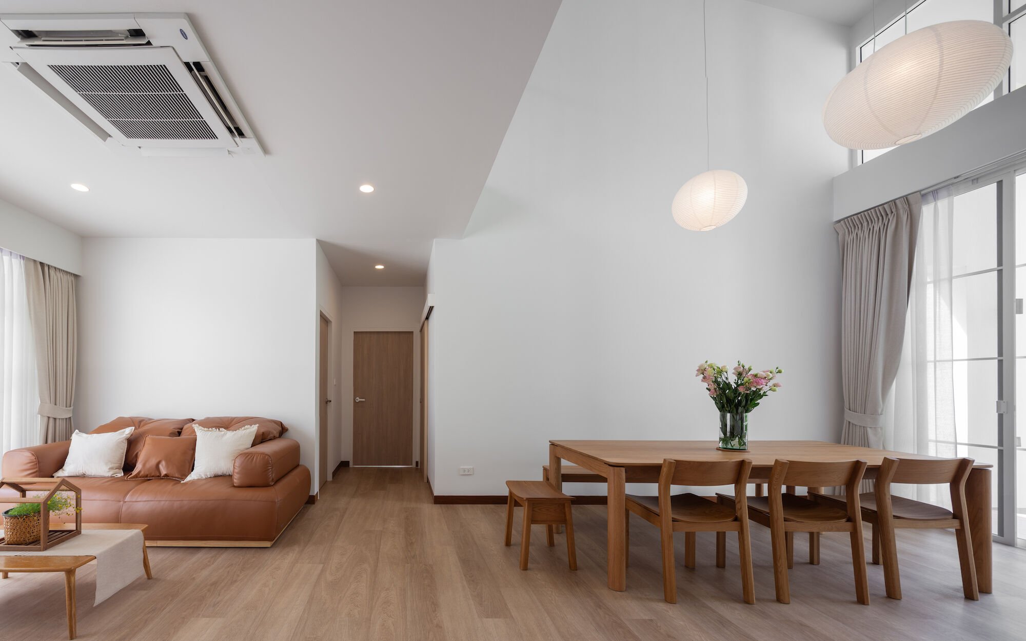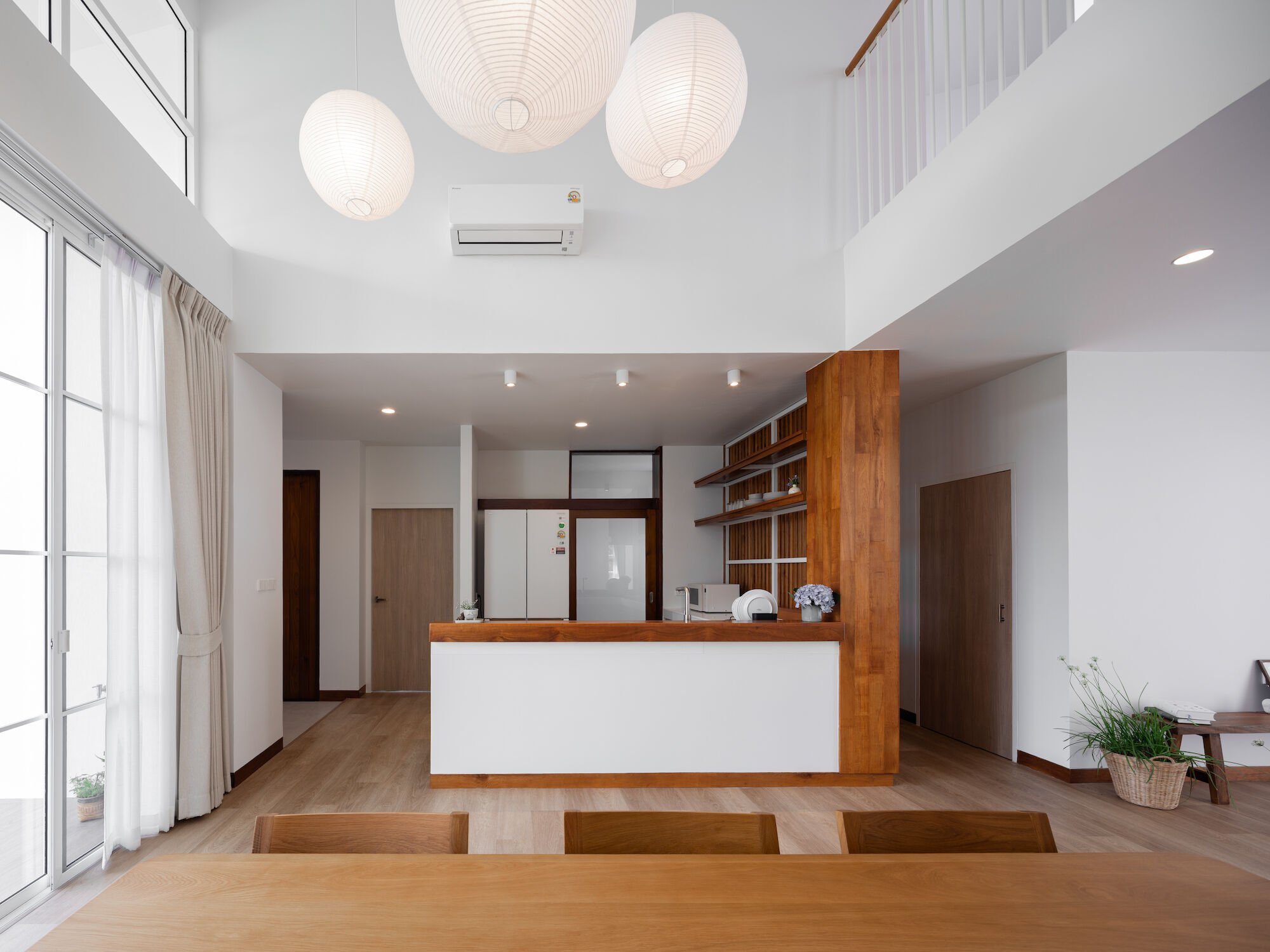Phần trung tâm là phòng khách, phòng ăn và bếp nằm trong sảnh rộng, trần cao gấp đôi. Khối nhà này đóng vai trò “trái tim” của NN House, nơi các thành viên quây quần. Trần cao tạo cảm giác rộng mở và thông thoáng, đồng thời giúp gió và ánh sáng lan tỏa tự nhiên.