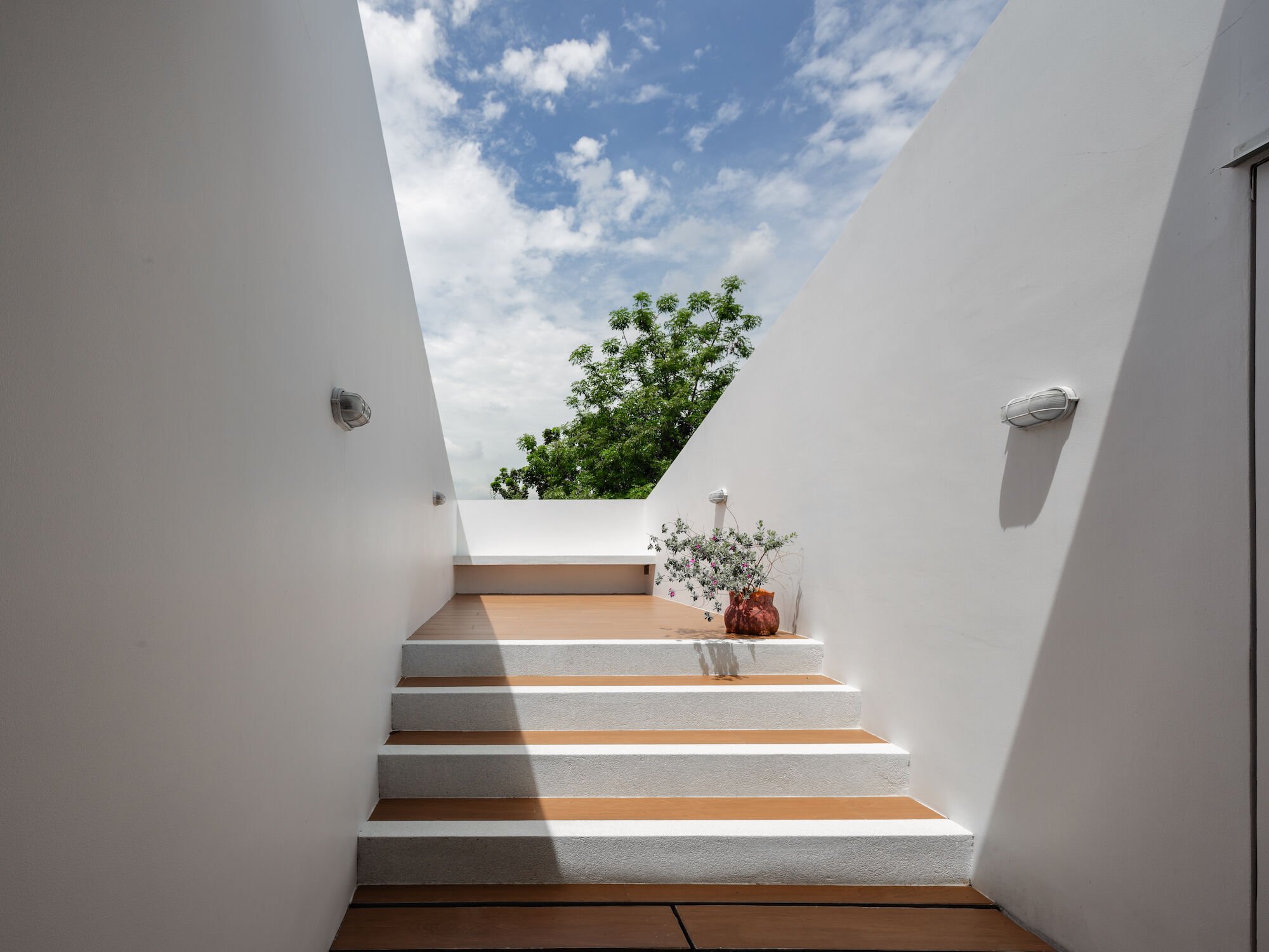 Lối cầu thang dẫn lên sân thượng và băng ghế ngồi thư giãn