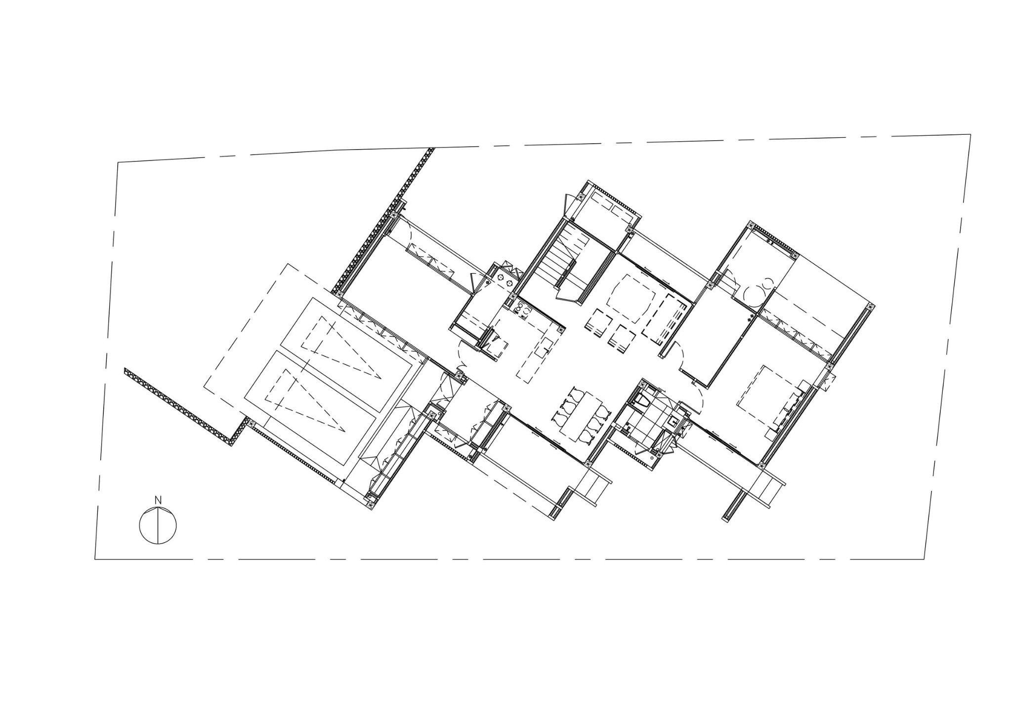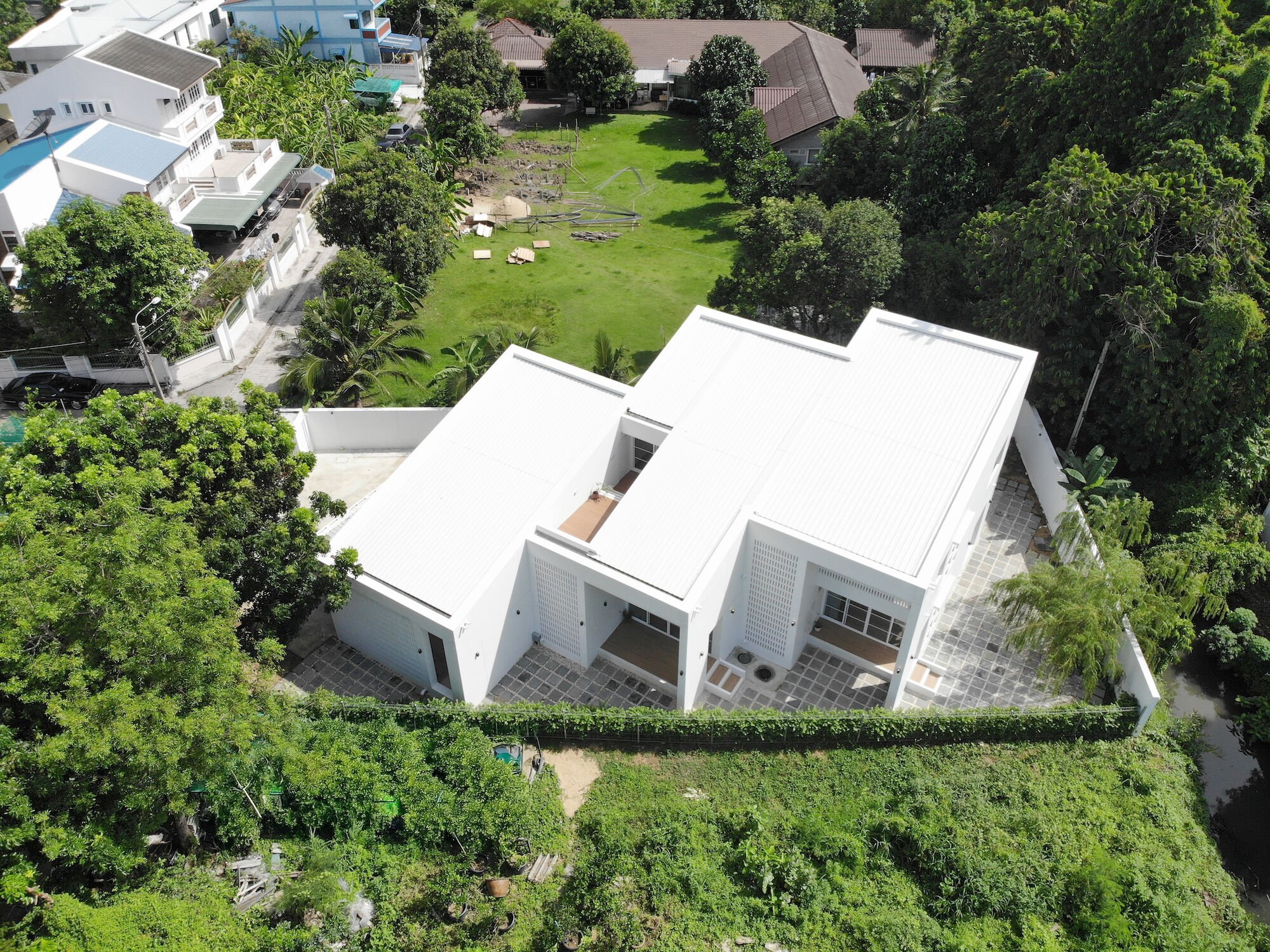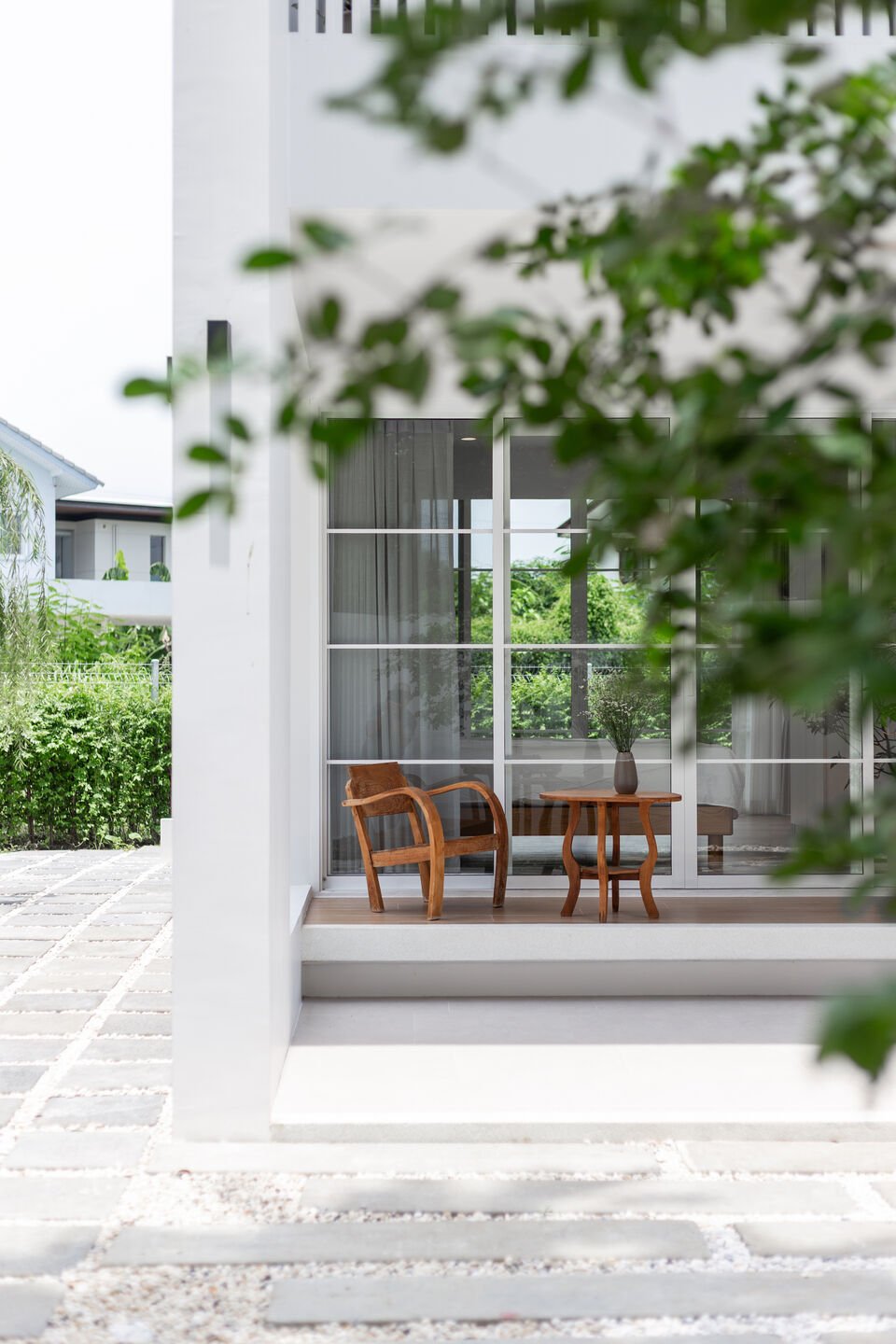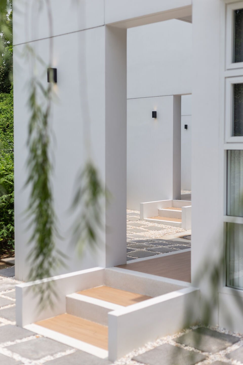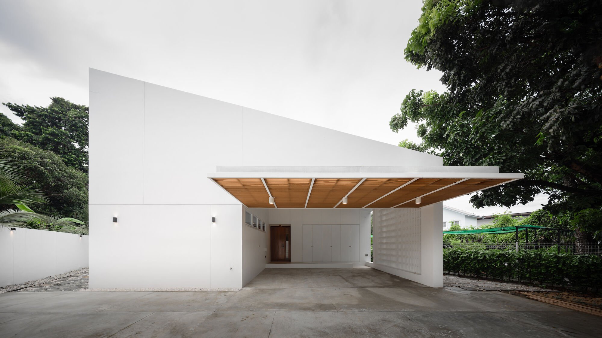 Khu vực ven Bangkok đang trong quá trình đô thị hóa mạnh, với hàng loạt nhà ở mới được xây dựng. Thay vì đặt song song ranh đất, nhóm thiết kế đã xoay NN House theo một góc nghiêng nhất định, giúp công trình vừa tránh tầm nhìn trực diện với hàng xóm, vừa tạo ra các khoảng sân thông thoáng – một cách ứng phó thông minh với tình trạng phát triển dày đặc liền kề.
