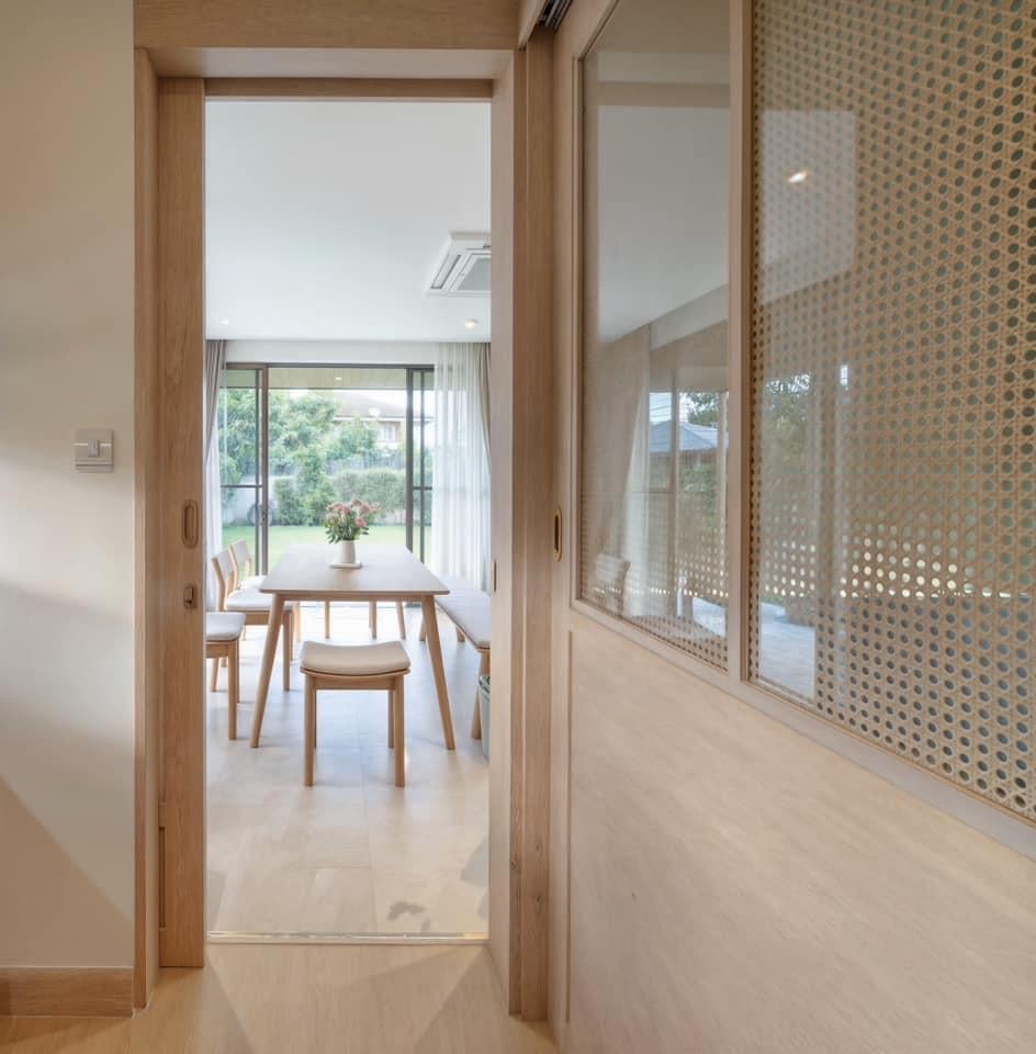 Từ lối đi nhìn thẳng ra phòng ăn, khung cảnh hiện lên ấm áp với ánh sáng chan hòa hai phía. Sự kết hợp giữa vật liệu gỗ và kính giúp không gian trong – ngoài hòa quyện tự nhiên, tạo cảm giác mở rộng dễ chịu