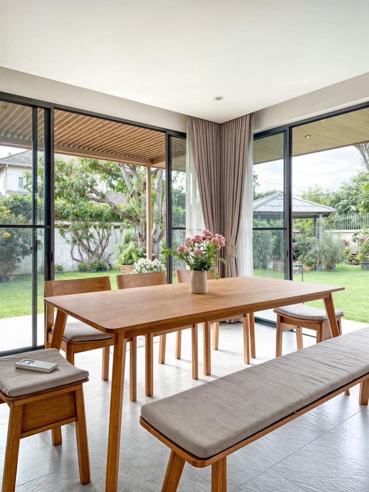 Không gian phòng ăn sáng bừng nhờ hệ cửa kính bao quanh, kết nối trực tiếp với khu vườn bên ngoài. Bàn ghế gỗ đơn giản cùng ghế băng dài mang lại cảm giác gần gũi, tự nhiên và dễ chịu cho mỗi bữa ăn
