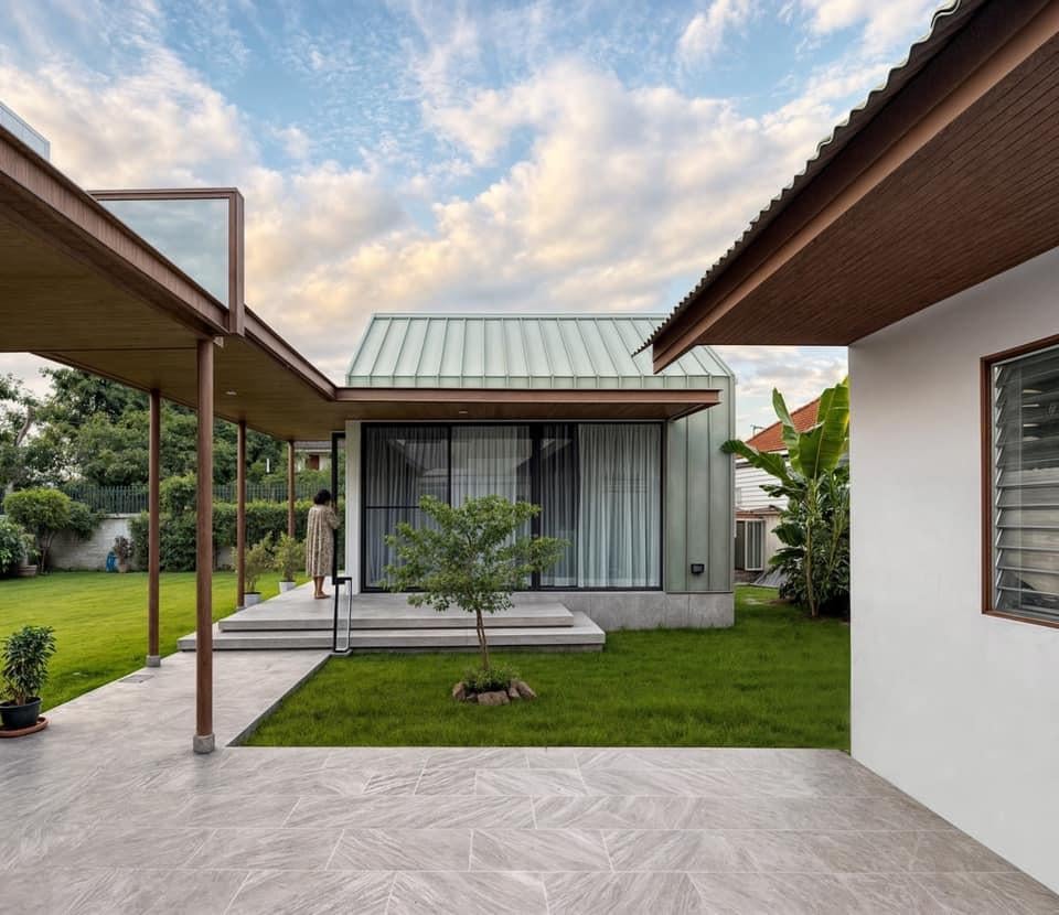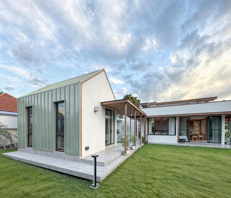 Khối nhà phụ với mái dốc kim loại phản sáng nhẹ, được nối liền với nhà chính bằng hành lang có mái che. Hệ cửa kính lớn giúp mở rộng tầm nhìn ra vườn, đồng thời đảm bảo thông gió chéo cho khu vực sinh hoạt