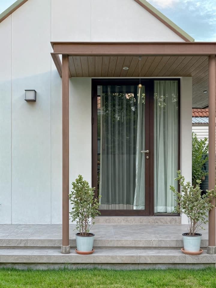 Lối vào khối phụ với mặt đứng tối giản và cửa kính khung gỗ nâu, hai chậu cây nhỏ tạo điểm nhấn xanh tươi trước hiên. Kiến trúc sư chọn đường nét vuông gọn, mái dốc nhẹ để giữ sự cân bằng giữa hiện đại và gần gũi