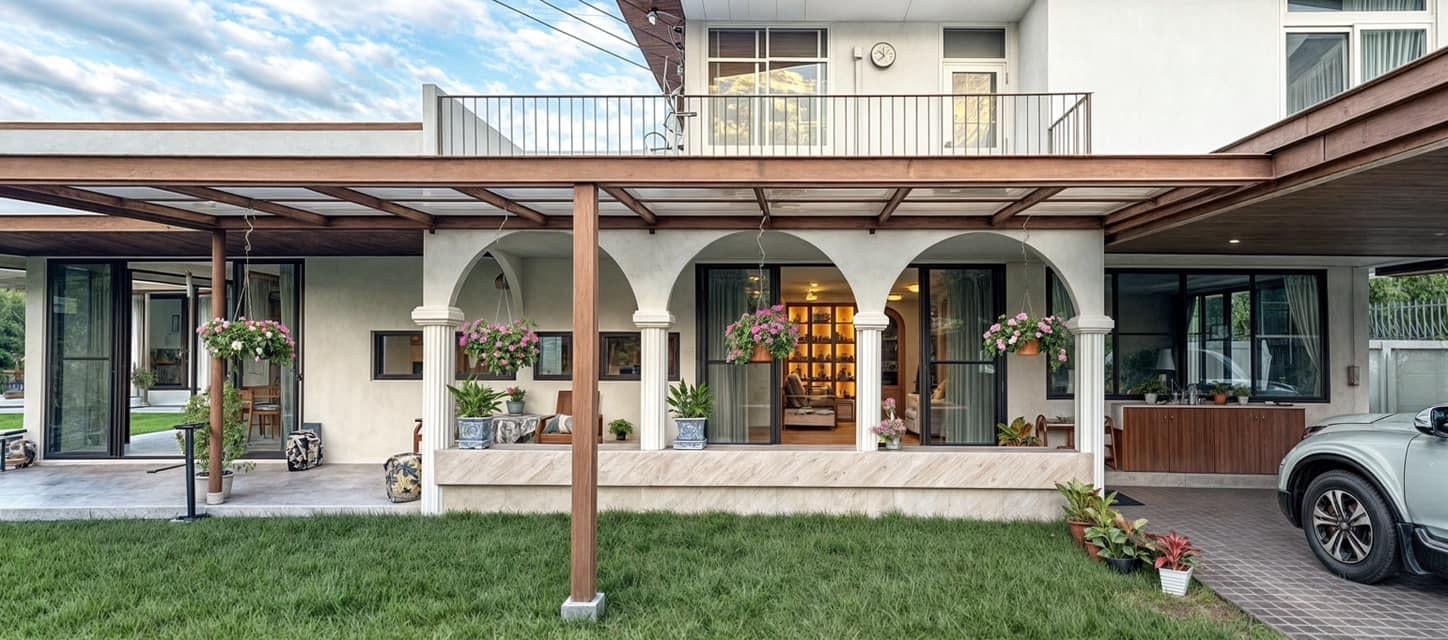 Hiên nhà với hàng cột nâu và mái che gỗ chạy dọc dãy nhà, dẫn lối ra khu sân cỏ xanh mát. Cấu trúc hành lang mở này vừa che nắng hiệu quả, vừa tạo nhịp điệu cho mặt tiền công trình