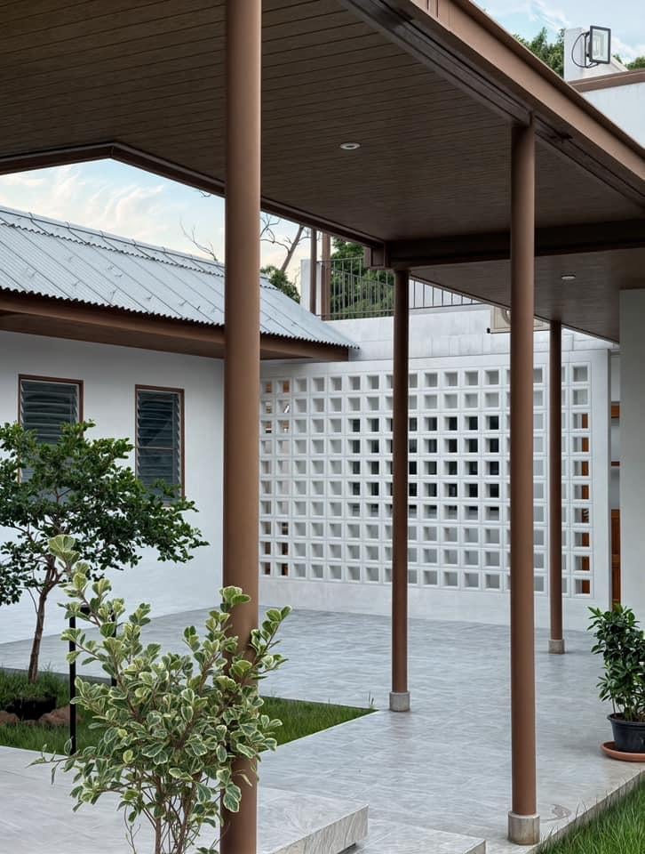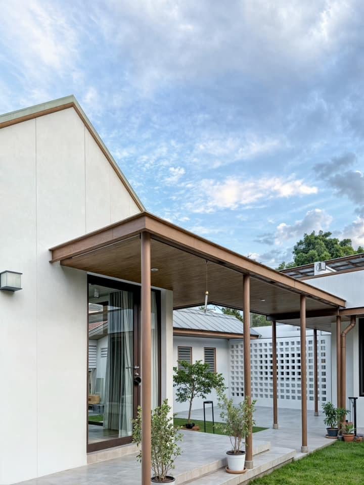 Giữa các khối nhà là hành lang dài có mái che, vừa giúp di chuyển thuận tiện, vừa tạo sự liên kết về hình khối. Độ vươn của mái được tính toán kỹ để che mưa nắng mà không gây tối cho công trình. Nhờ đó, dù trời nắng hay mưa, các thành viên vẫn có thể đi lại thoải mái giữa các khu vực.