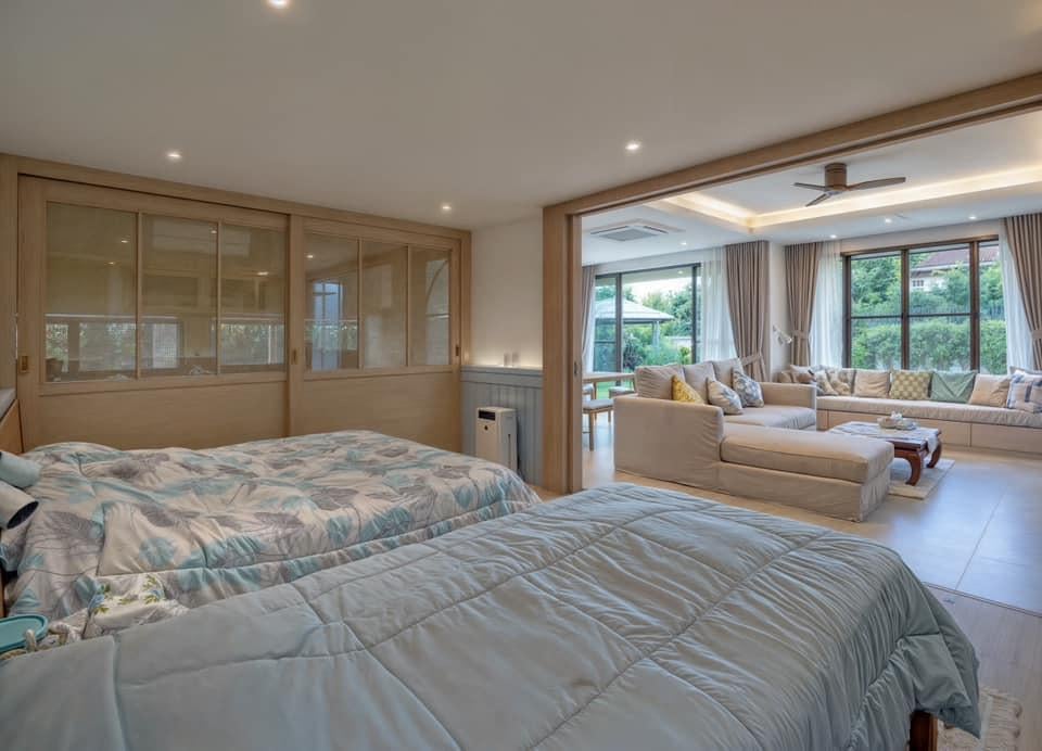 Phòng ngủ và phòng khách được bố trí liên thông, chỉ ngăn cách bằng cửa trượt gỗ khung kính. Cách sắp xếp này giúp không gian mở rộng thị giác, tối ưu ánh sáng và tạo cảm giác ấm cúng cho sinh hoạt gia đình