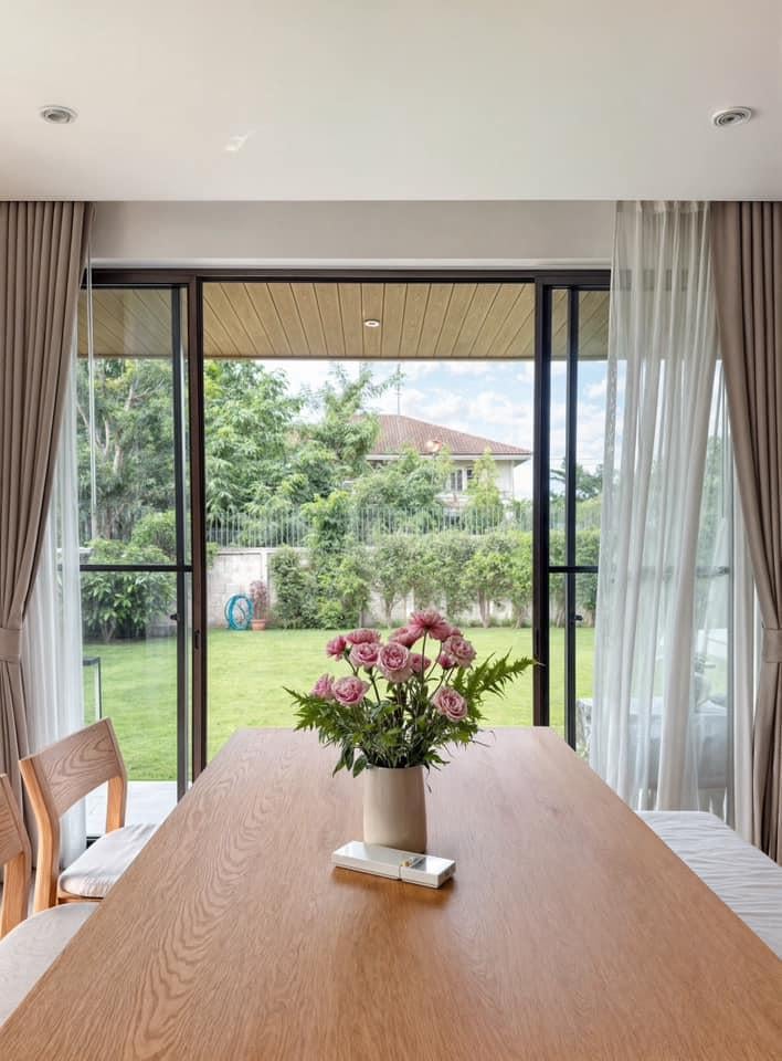 Bàn ăn bằng gỗ tự nhiên đặt cạnh khung cửa kính lớn hướng ra vườn, mang lại cảm giác như đang dùng bữa giữa thiên nhiên. Thiết kế này thể hiện tinh thần của 3T HOUSE: gần gũi, ấm cúng và đầy cảm xúc