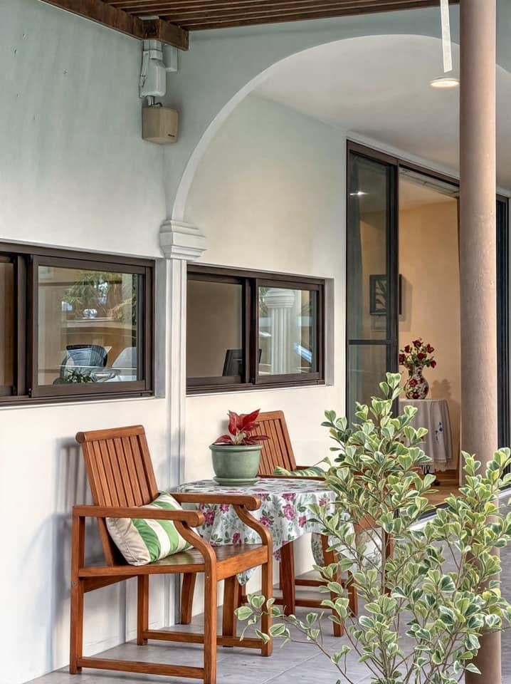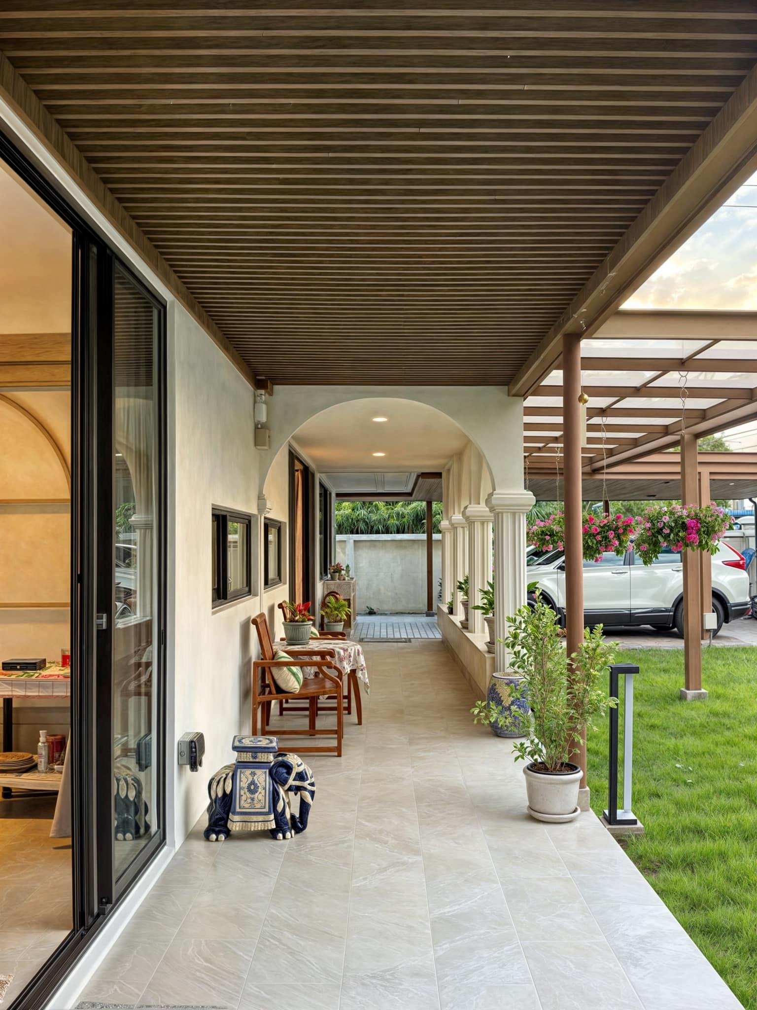 Hiên nhà dài với trần lam gỗ và dãy cột vòm mang hơi hướng bán cổ điển, kết hợp cùng bàn ghế gỗ và chậu cây cảnh. Không gian này như một phòng khách ngoài trời, nơi gia chủ có thể thư giãn, đọc sách hay thưởng trà giữa khung cảnh xanh mát