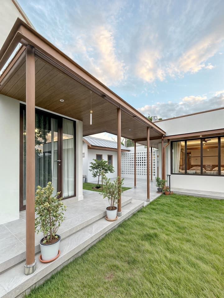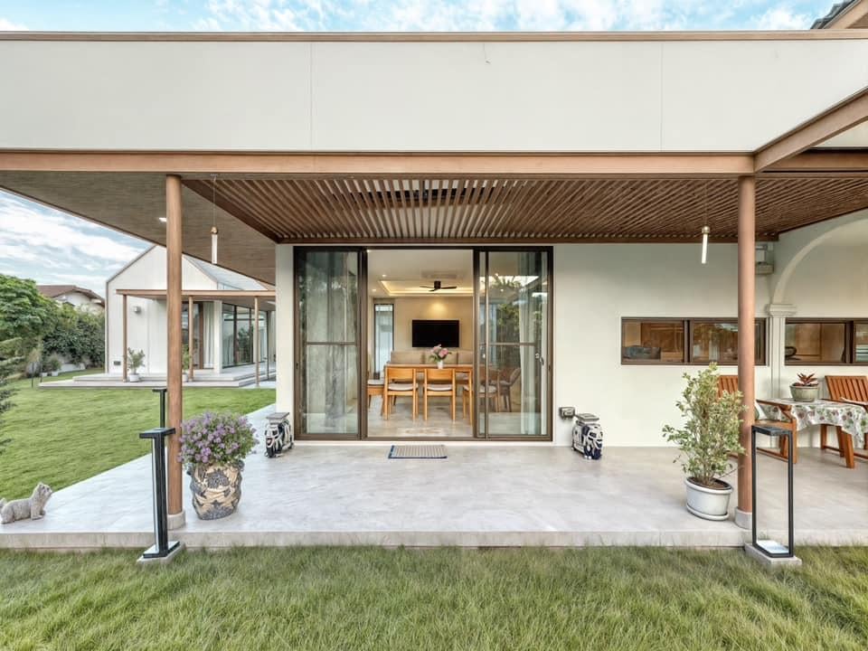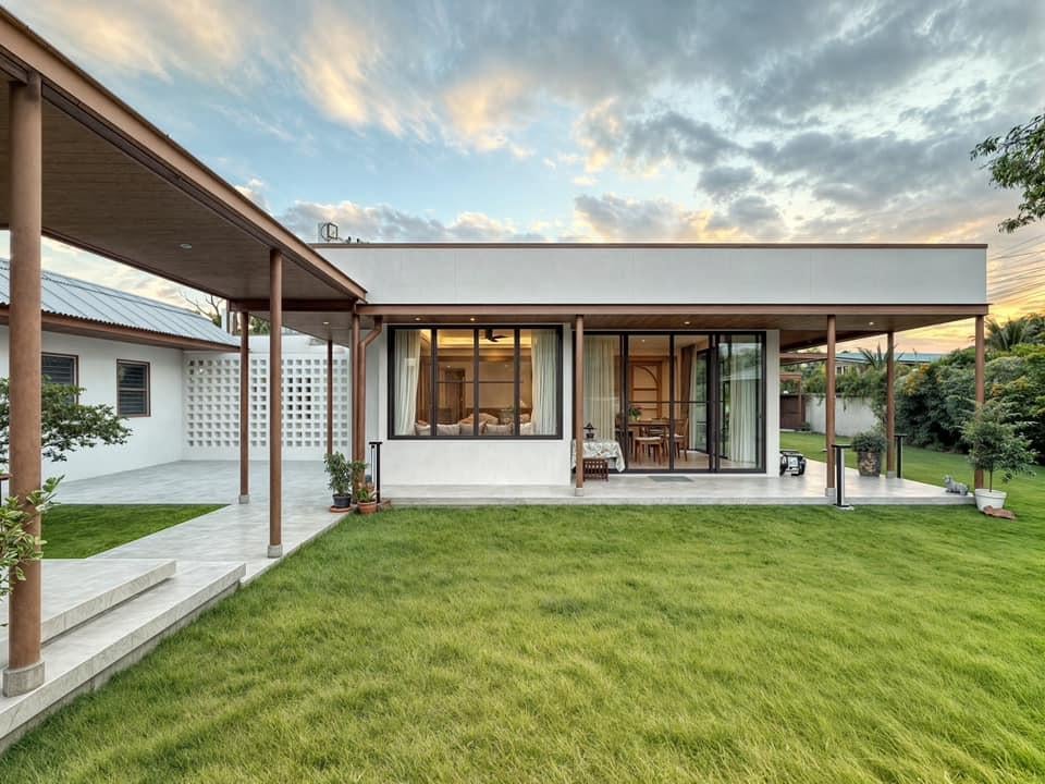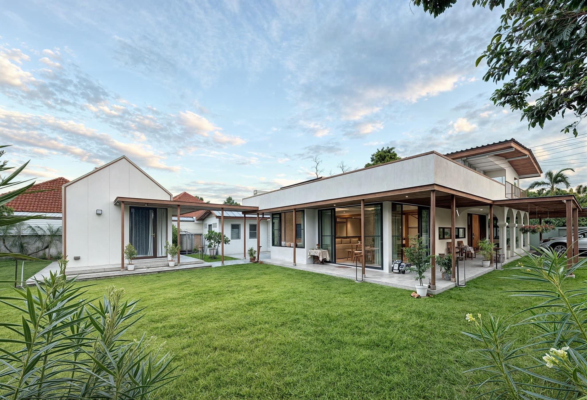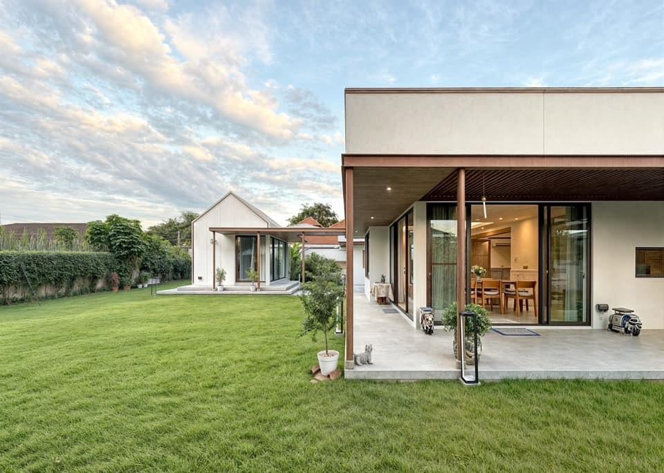 Toàn cảnh 3T HOUSE với khối nhà chính trải dài theo phương ngang, mở ra khoảng sân cỏ rộng giữa khu dân cư Bangkok. Thiết kế mái hiên và hành lang gỗ giúp tạo bóng mát tự nhiên, kết nối liền mạch giữa các không gian sinh hoạt