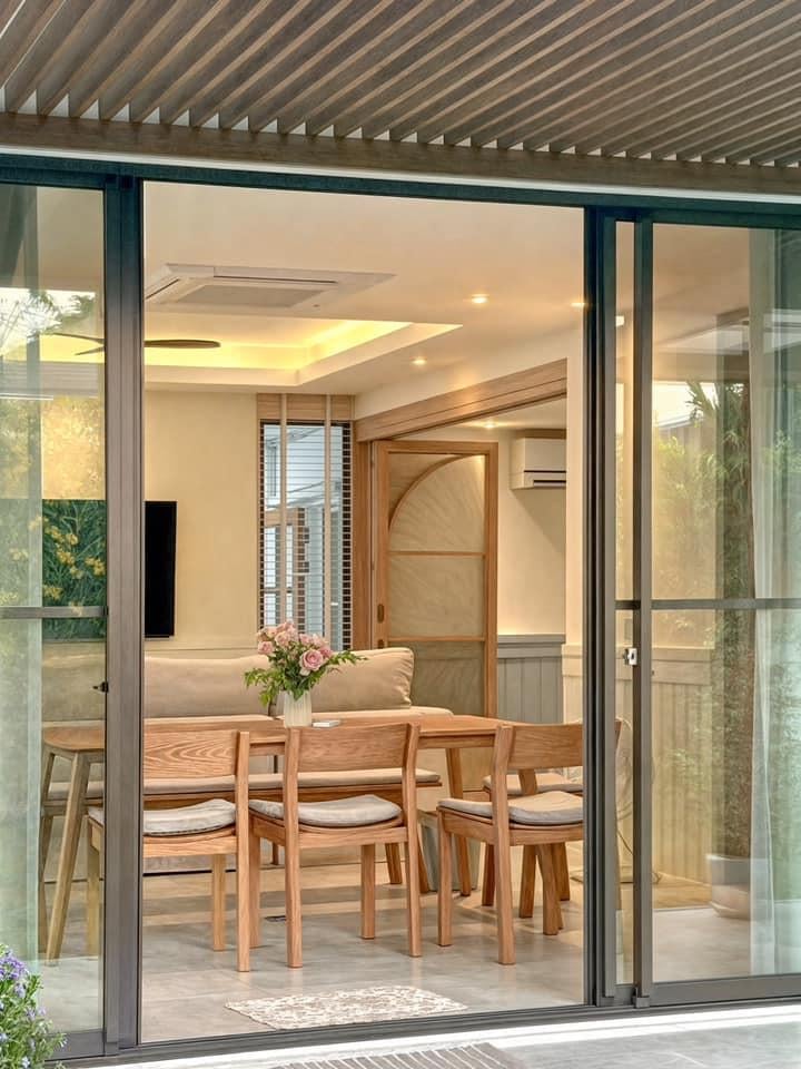 • Khung cửa gỗ và lam trần ngoài trời mang lại cảm giác ấm áp, tự nhiên.