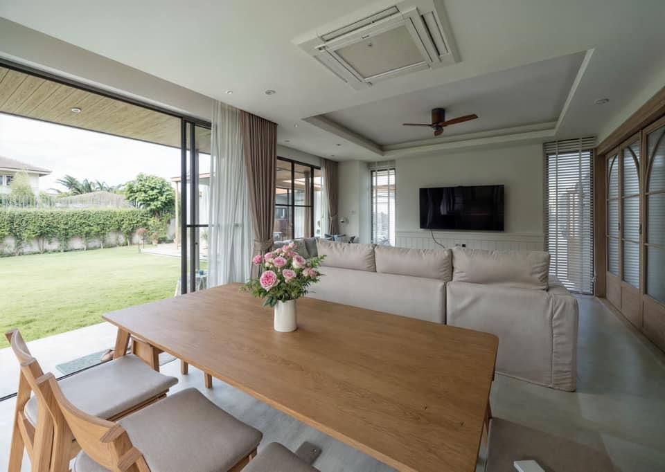 Phòng khách nằm ở trung tâm khối chính, mở rộng ra khoảng sân cỏ bằng hệ cửa kính trượt toàn chiều cao. Ánh sáng tự nhiên tràn ngập không gian, kết hợp với trần cao và quạt trần gỗ giúp lưu thông không khí dễ dàng. Từ bên trong, người ngồi có thể nhìn thấy toàn bộ khu vườn - nơi sắc xanh và ánh sáng thay đổi theo từng thời điểm trong ngày.
