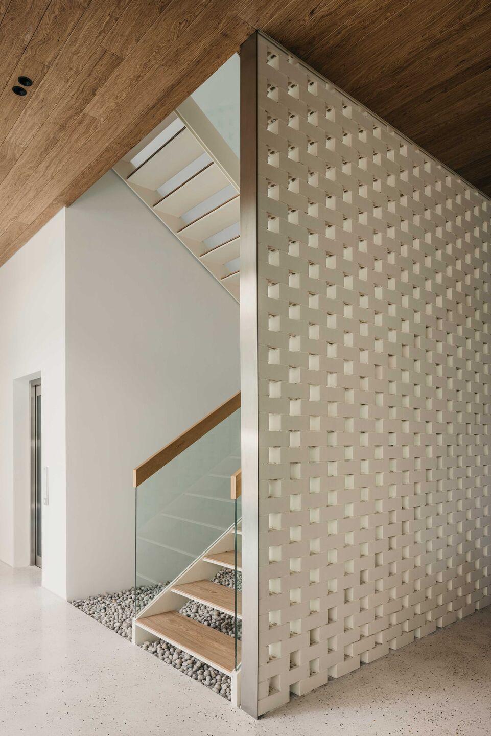 Lối cầu thang trung tâm của nhà được bao quanh bởi tường gạch trắng có khe hở đều nhau. Các khe này giúp không khí lưu chuyển dễ dàng, đồng thời tạo hiệu ứng ánh sáng thay đổi trong ngày. Khi nắng chiếu qua, bóng của từng viên gạch đổ xuống nền tạo nên những mảng sáng – tối đầy nhịp điệu, khiến không gian bếp và bàn ăn luôn sống động mà không cần trang trí cầu kỳ.
