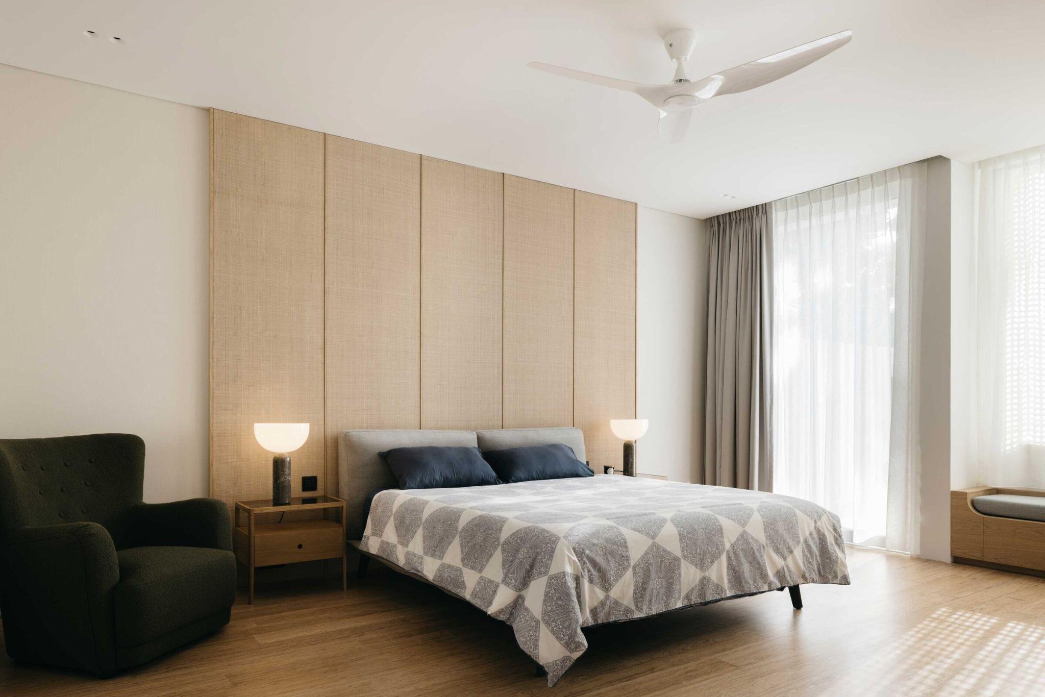 Phòng ngủ chính mang phong cách tối giản, sử dụng vật liệu mộc và ánh sáng tự nhiên để tạo cảm giác thư giãn, yên tĩnh