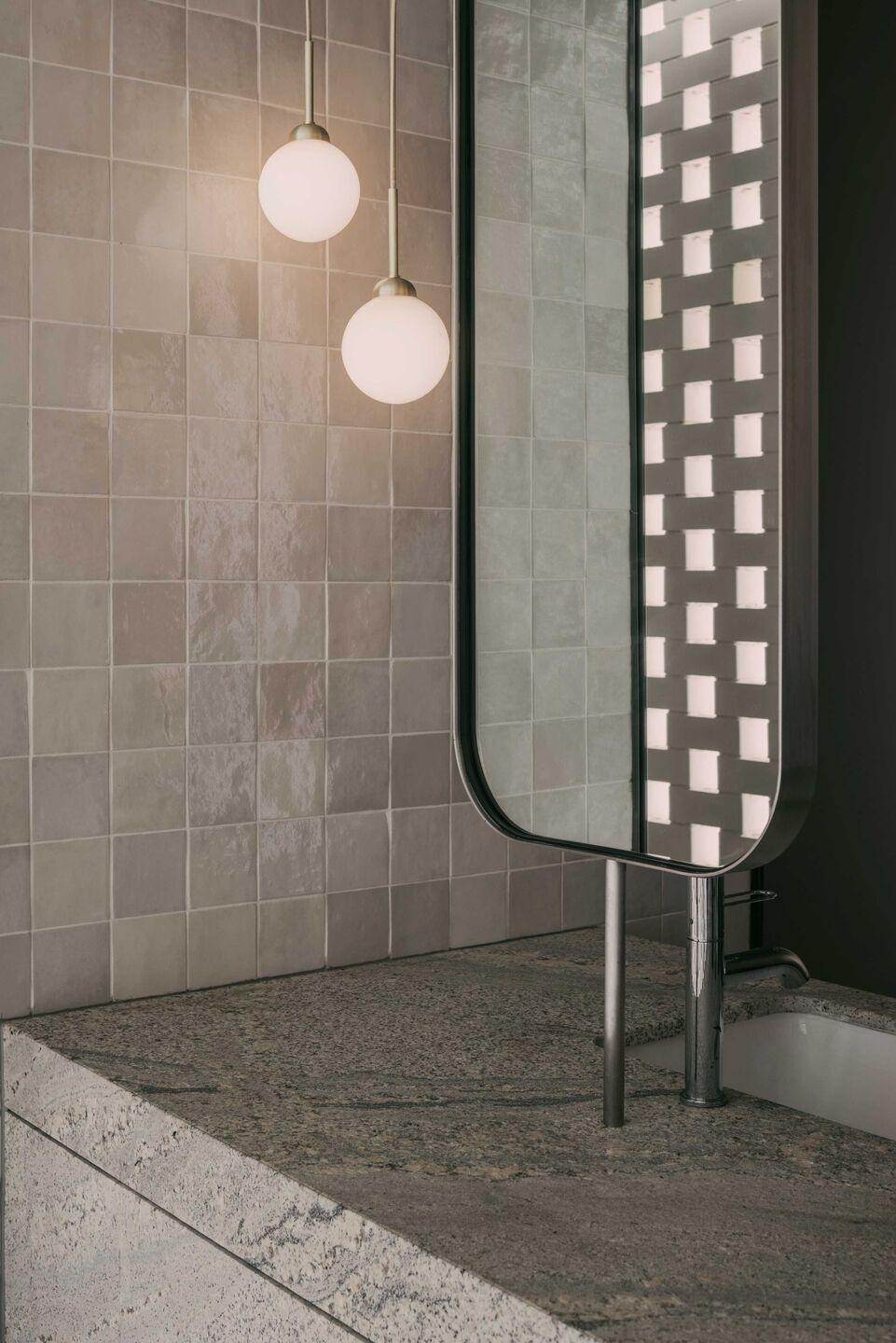 Chi tiết gương soi bo tròn kết hợp đèn tròn thả trần, phản chiếu ánh sáng mềm mại trên nền gạch xám nhạt