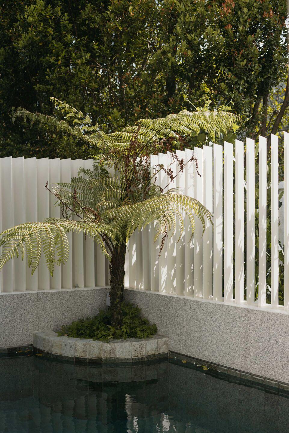 Cây dương xỉ được trồng trong bồn góc hồ, vừa tạo điểm nhấn sinh động vừa giúp làm dịu ánh nắng và tăng độ riêng tư cho khu vực ngoài trời