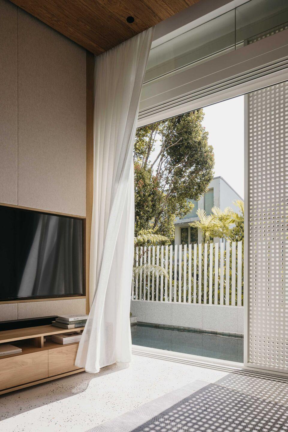 Phòng khách mở rộng ra khu hồ bơi với rèm trắng mềm mại, mang ánh sáng tự nhiên và làn gió mát tràn vào không gian sinh hoạt chung