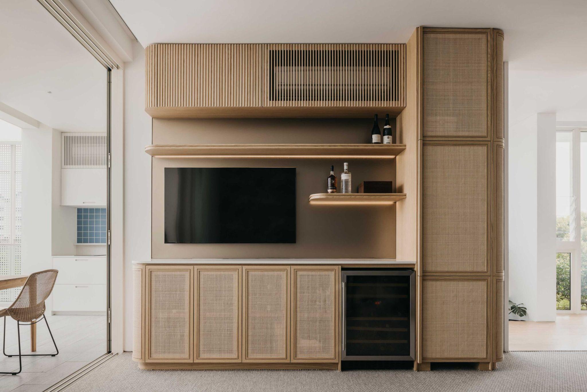 Hệ tủ kệ âm tường ốp gỗ mây, kết hợp ánh sáng gián tiếp tinh tế tạo cảm giác ấm áp, thanh lịch cho không gian sinh hoạt chung