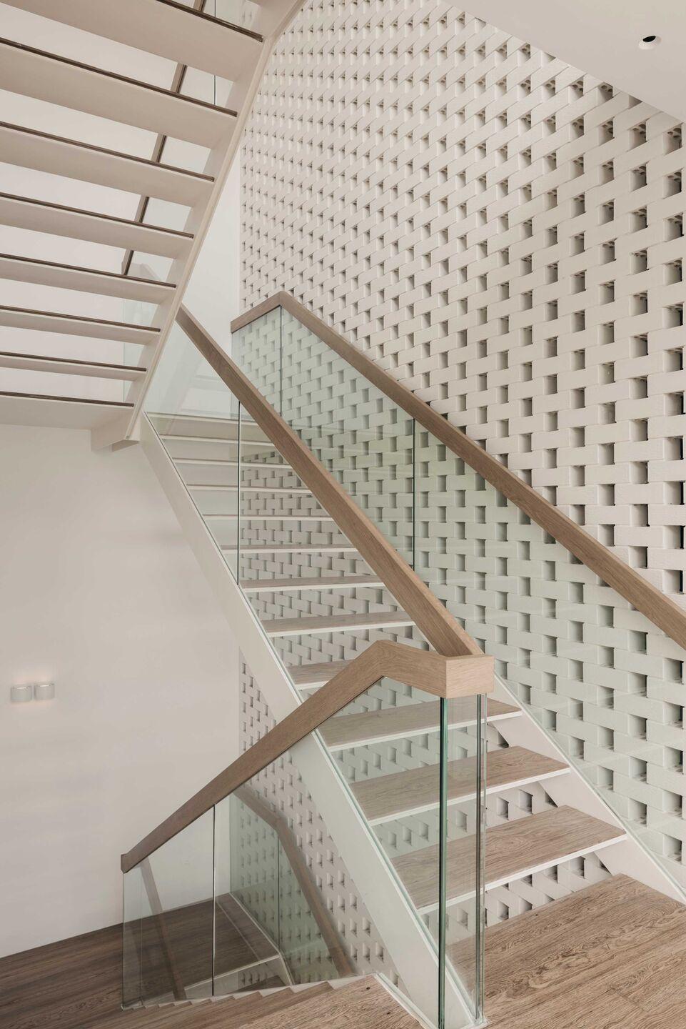 Cầu thang gỗ kết hợp tay vịn kính và tường gạch thưa, cho phép ánh sáng tự nhiên xuyên qua tạo hiệu ứng bóng đổ đẹp mắt