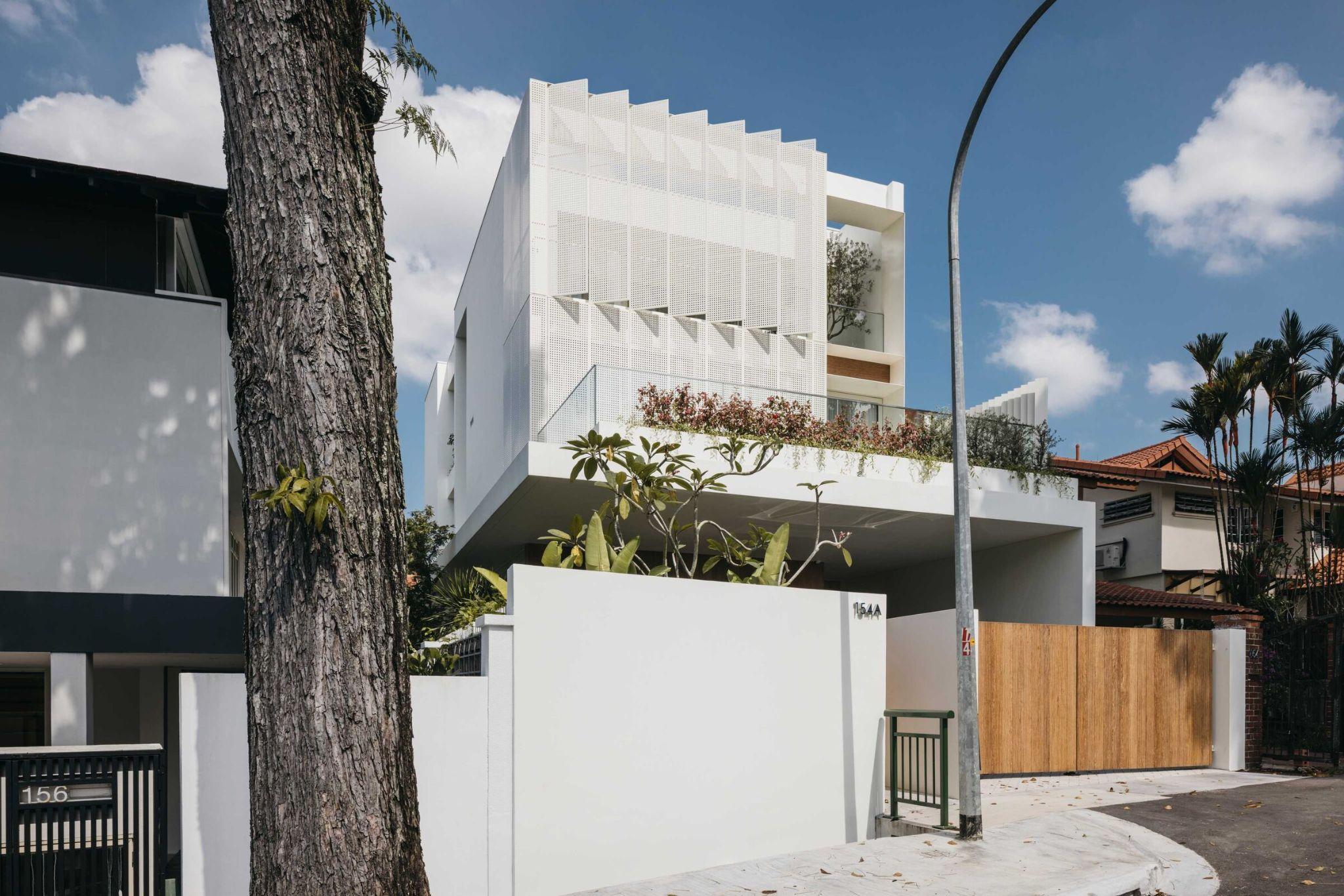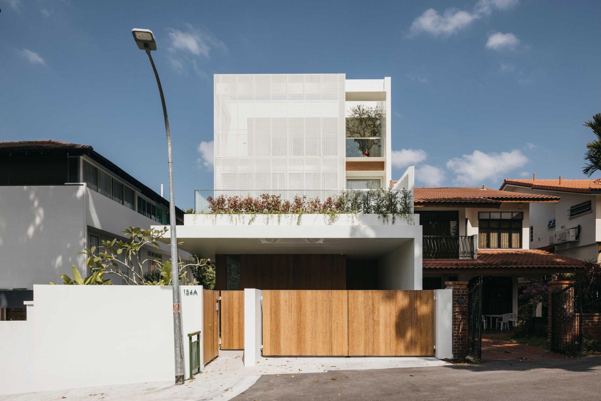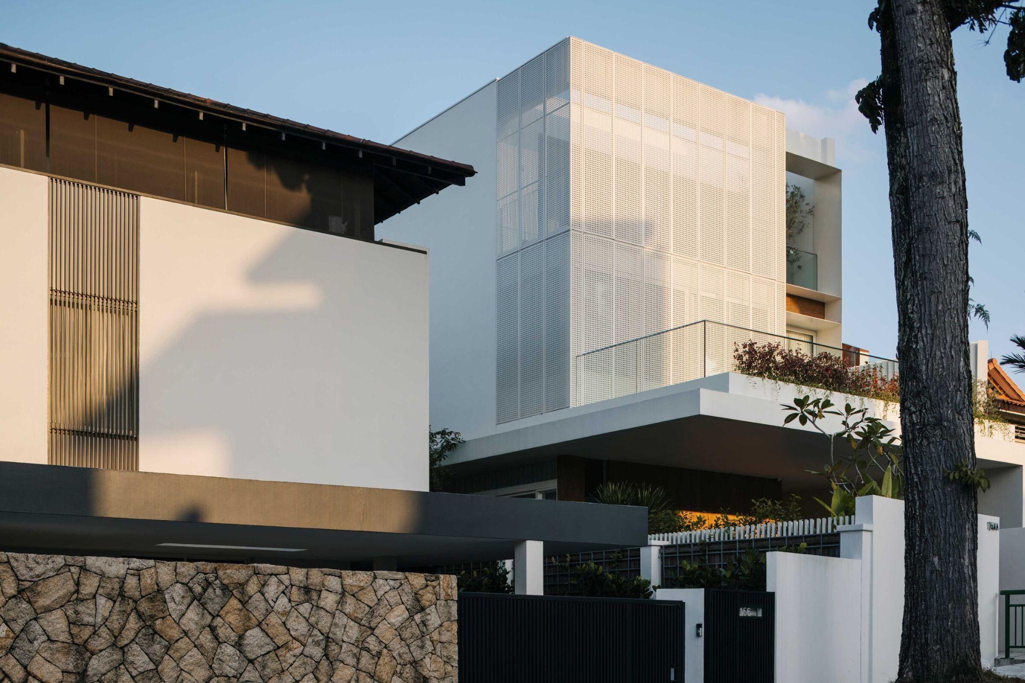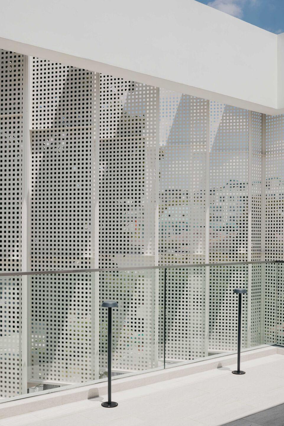 Mặt tiền công trình với khối hộp trắng hiện đại, hệ lam nhôm đục lỗ bao quanh tạo vẻ nhẹ nhàng và riêng tư