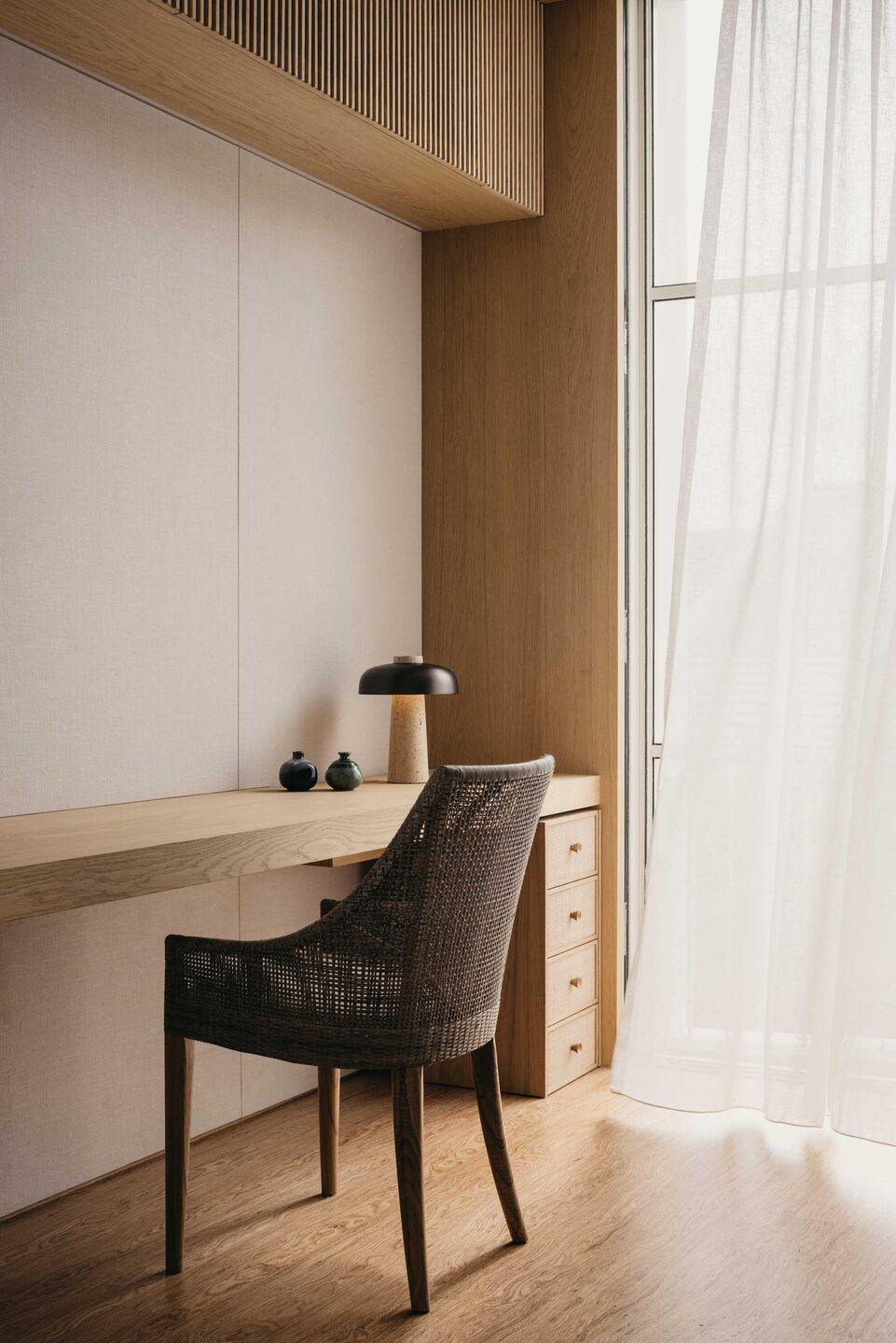 Không gian làm việc tối giản với bàn và tủ gỗ sáng màu, ghế mây tự nhiên và rèm trắng bay nhẹ, mang đến sự tập trung và yên tĩnh