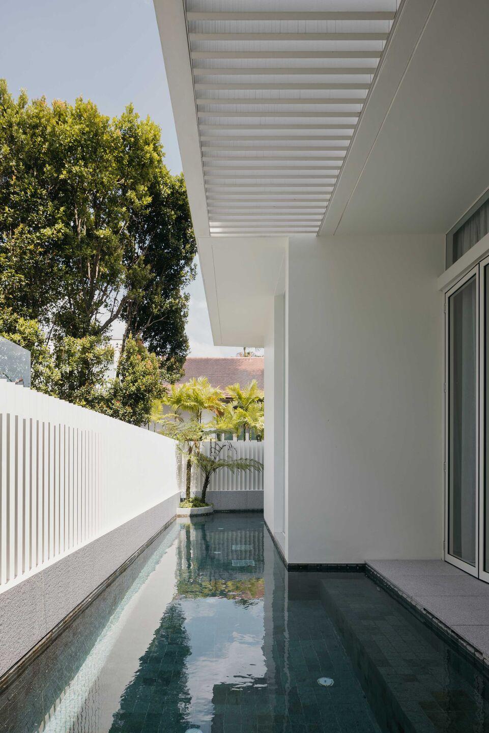 Hồ bơi chạy dọc theo chiều dài công trình không chỉ là nơi thư giãn mà còn đóng vai trò điều hòa nhiệt độ tự nhiên. Hàng cây bản địa được bố trí dọc theo hàng rào và góc hồ, vừa giúp tăng độ riêng tư, vừa làm dịu ánh nắng. Cây dương xỉ, tre cảnh và các loại lá nhiệt đới được chọn vì khả năng chịu nắng tốt, ít rụng lá và giữ màu xanh quanh năm.