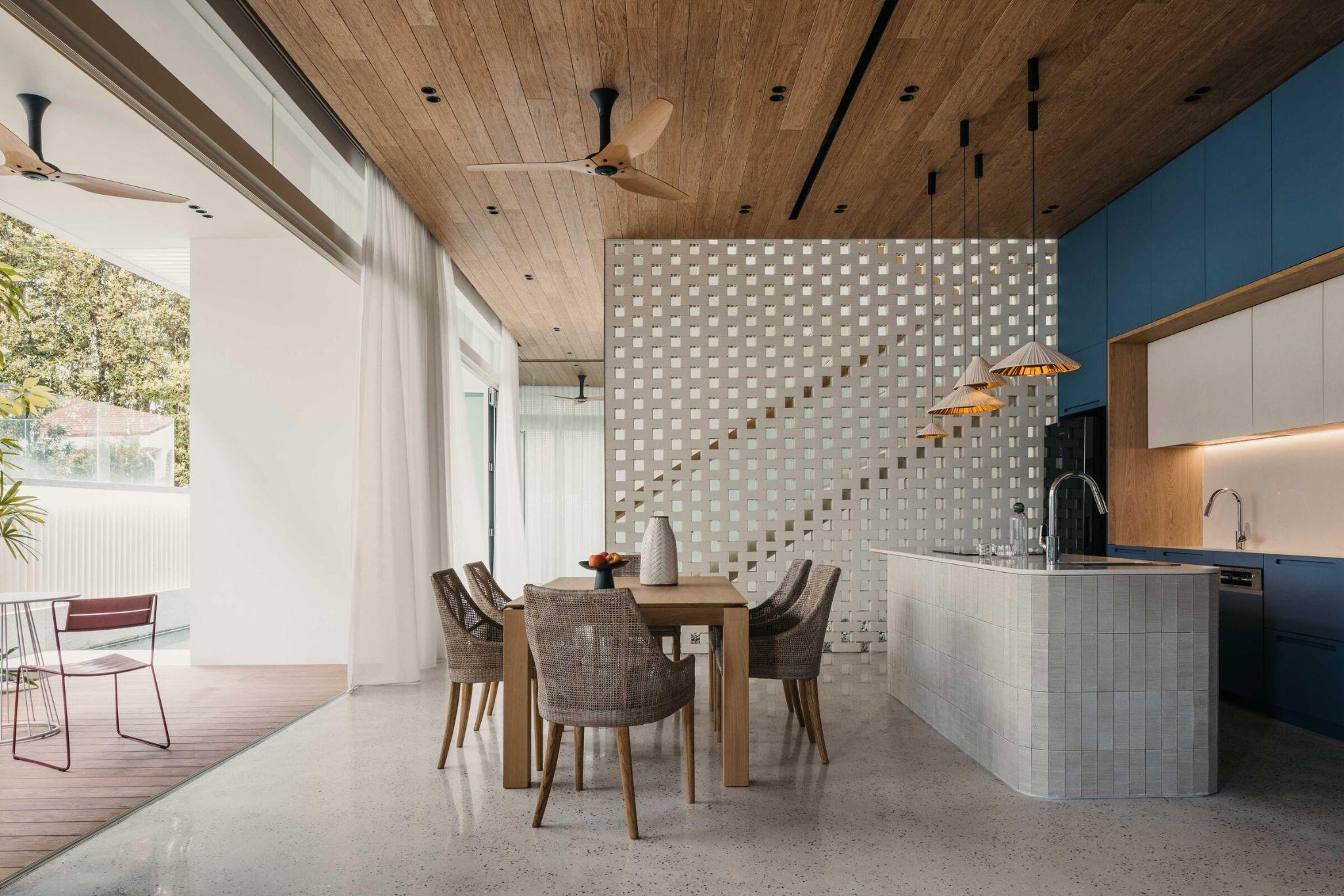 Không gian bếp – bàn ăn liền mạch, được ngăn nhẹ bằng tường gạch thông gió giúp khu vực luôn sáng và thoáng, kết hợp vật liệu gỗ và màu trung tính tạo cảm giác ấm cúng