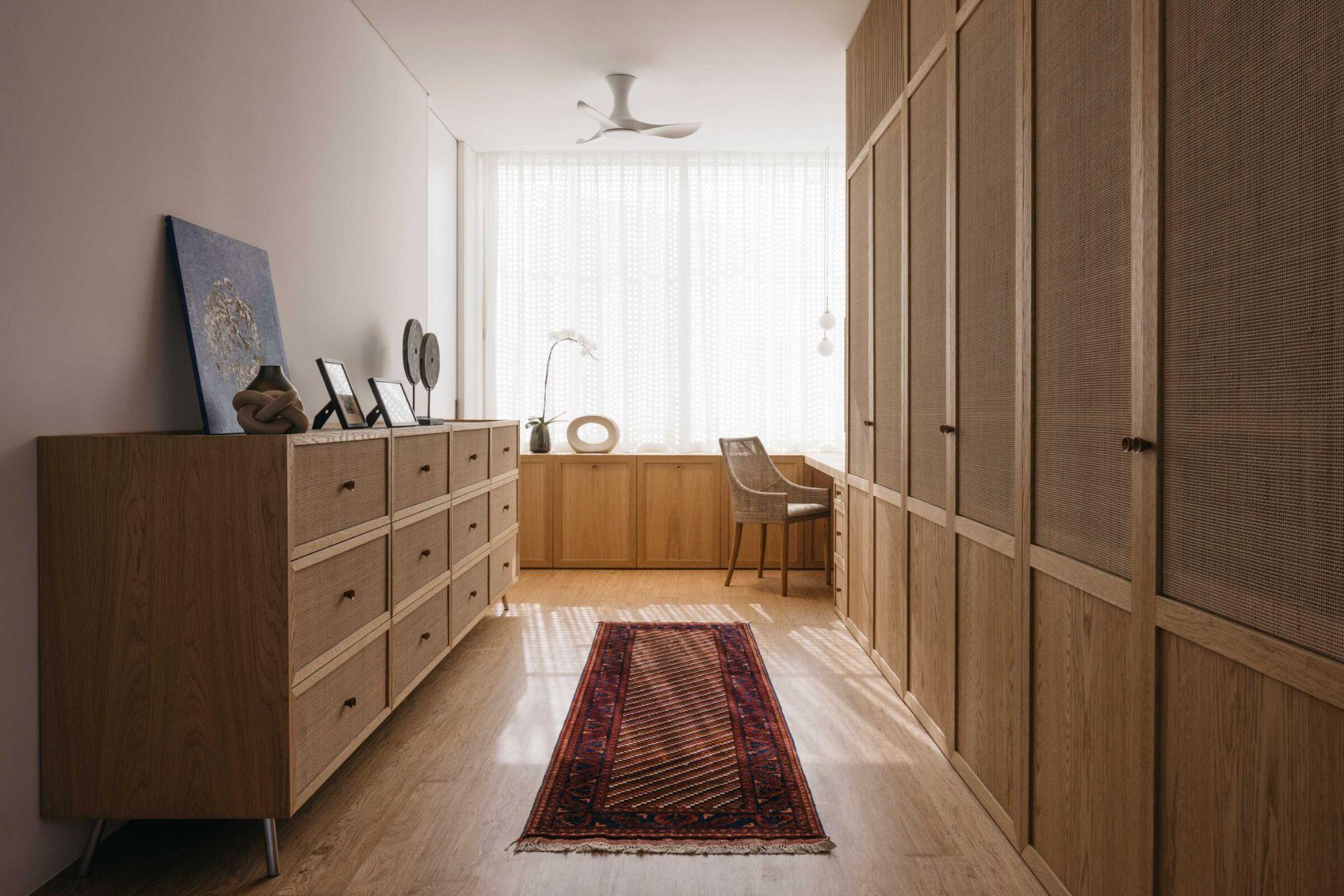 Phòng thay đồ ấm cúng với tông gỗ sáng, ánh sáng hắt nhẹ qua rèm trắng và tấm thảm dài tạo điểm nhấn mang hơi thở Đông Dương