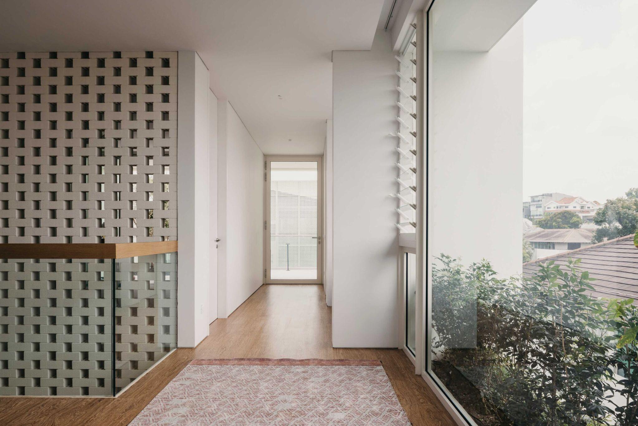 Hành lang tầng trên được chiếu sáng tự nhiên qua tường gạch thông gió và dải cửa lá sách, mang lại sự thông thoáng và cảm giác mềm mại cho khối nhà