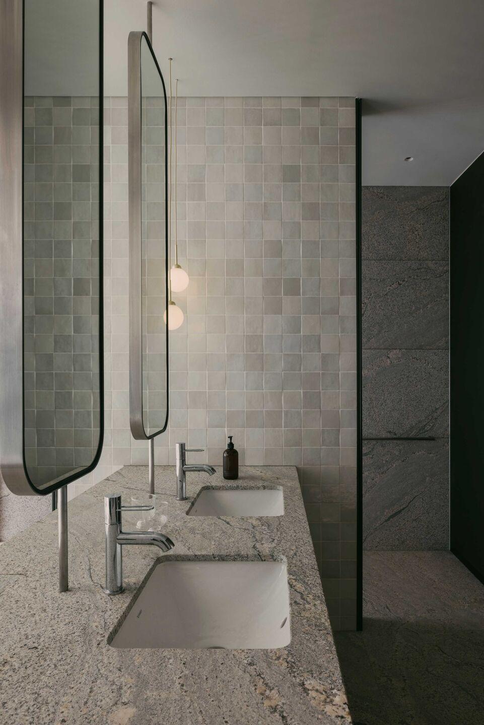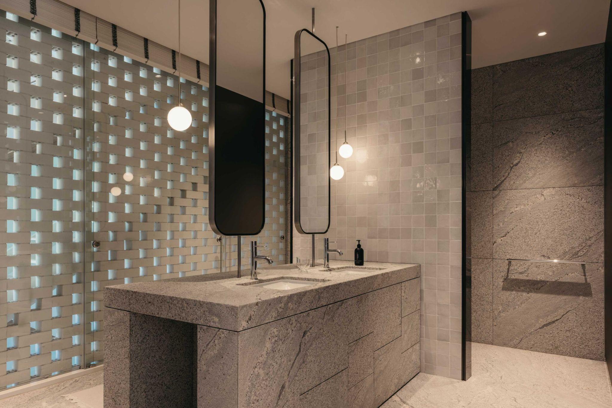 Phòng tắm chính sử dụng tường gạch thông gió và đá granite xám, ánh sáng lọc qua nhẹ nhàng tạo cảm giác thư giãn