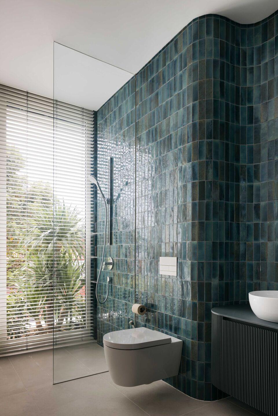 Phòng tắm phụ ốp gạch gốm xanh lam ánh men, tạo cảm giác mát mẻ và gần gũi thiên nhiên, đồng thời tận dụng ánh sáng tự nhiên qua khung cửa kính lớn