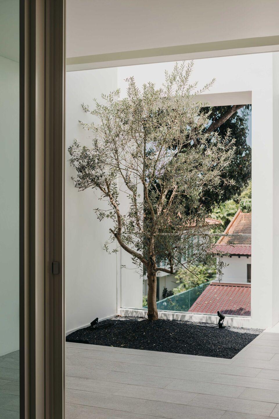 Cây ô liu vươn mình giữa khoảng thông tầng, đóng vai trò như điểm nhấn tự nhiên giúp làm dịu nắng và cân bằng khối kiến trúc hiện đại