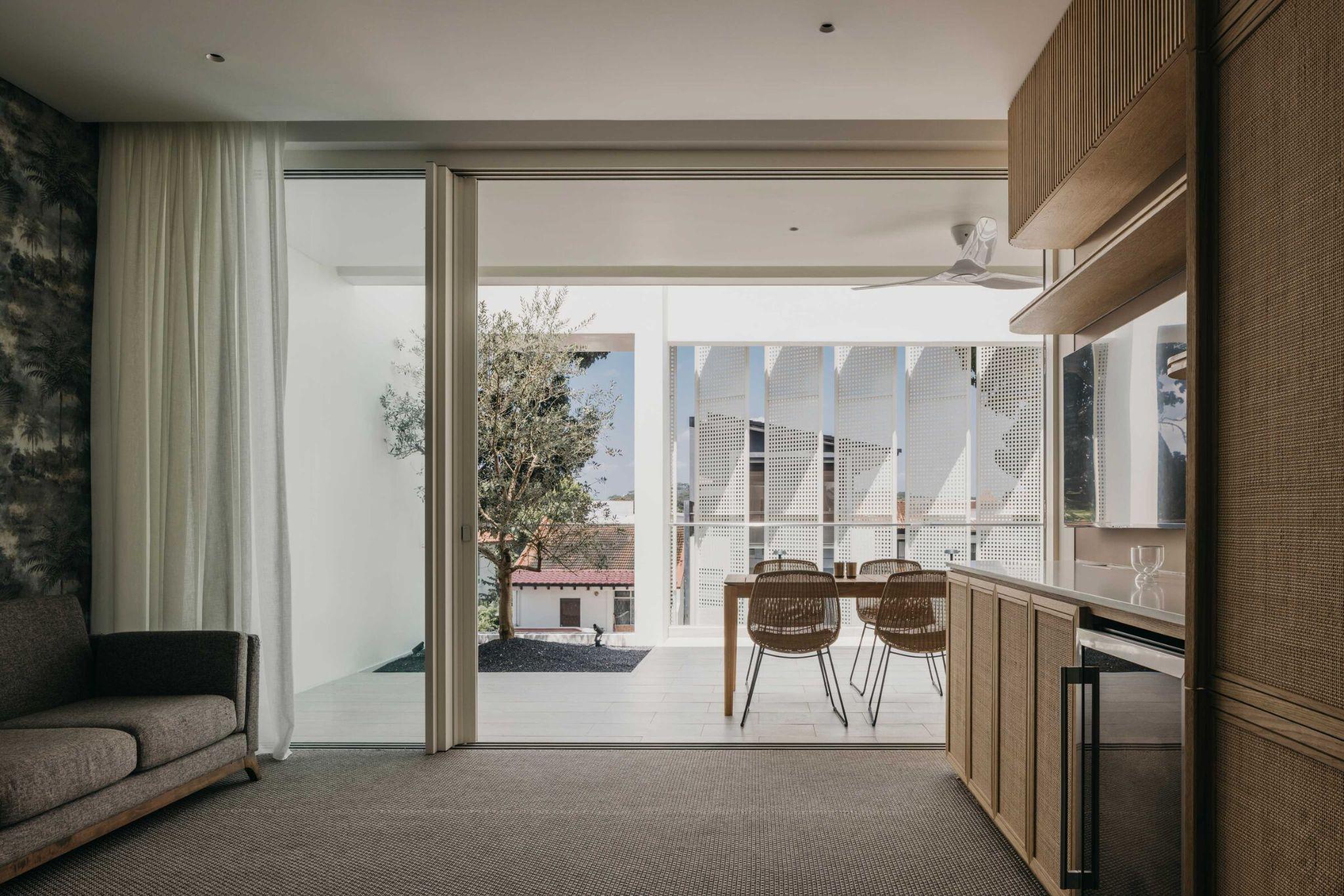 Sân thượng tối giản với bàn ăn gỗ và cây ô liu trồng trong hộc đất giữa sân, mang lại cảm giác mát mẻ và thiền tĩnh giữa lòng phố