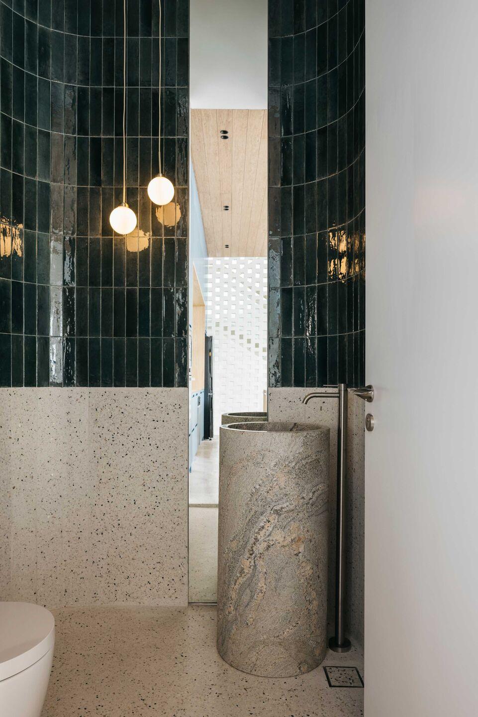 Phòng tắm phụ nổi bật với tường ốp gạch xanh rêu bóng loáng và bồn rửa đá nguyên khối hình trụ độc đáo