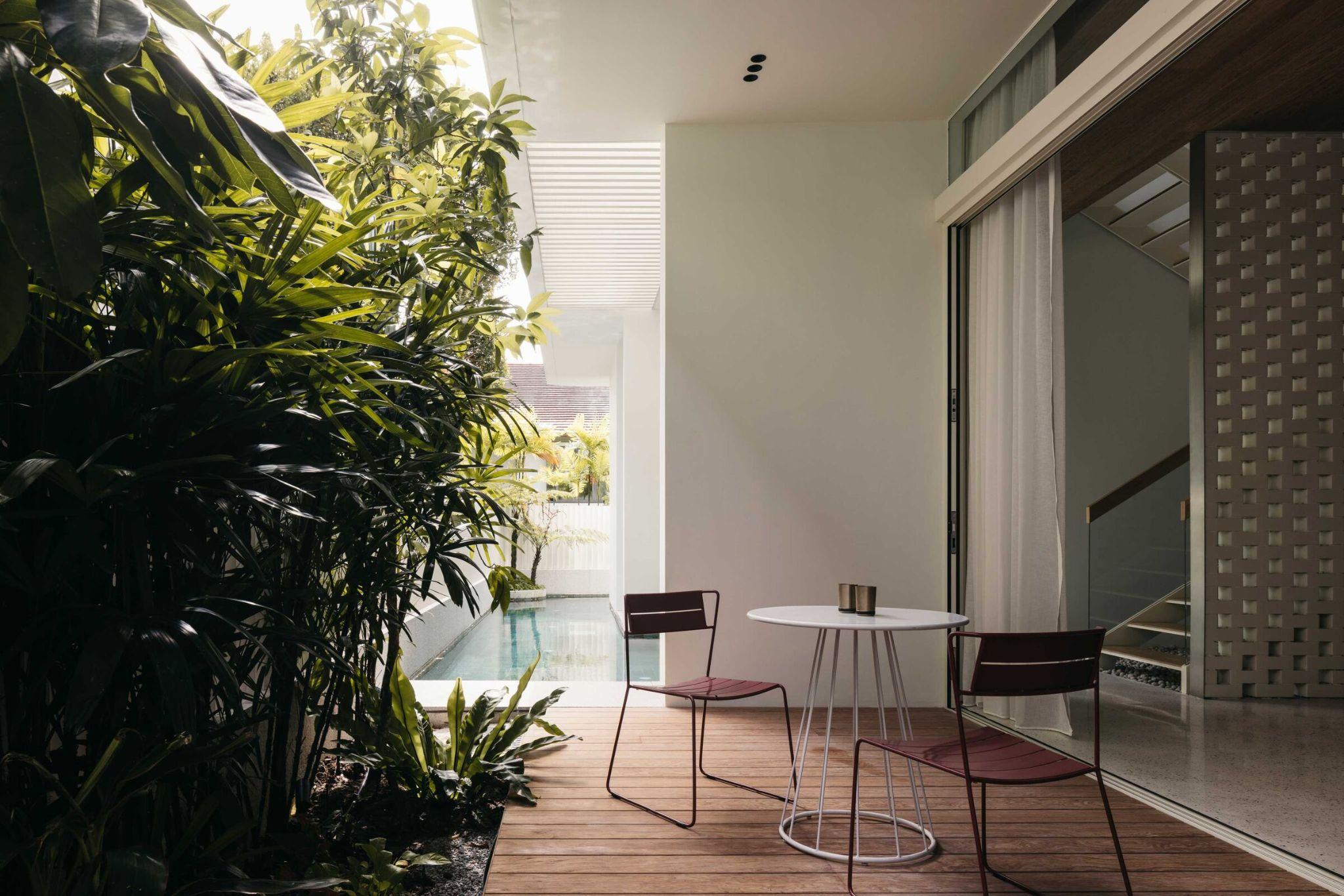 Góc hiên nhỏ lát gỗ, đặt bộ bàn ghế sắt thanh mảnh hướng ra hồ bơi, là không gian lý tưởng để thư giãn hoặc trò chuyện nhẹ nhàng