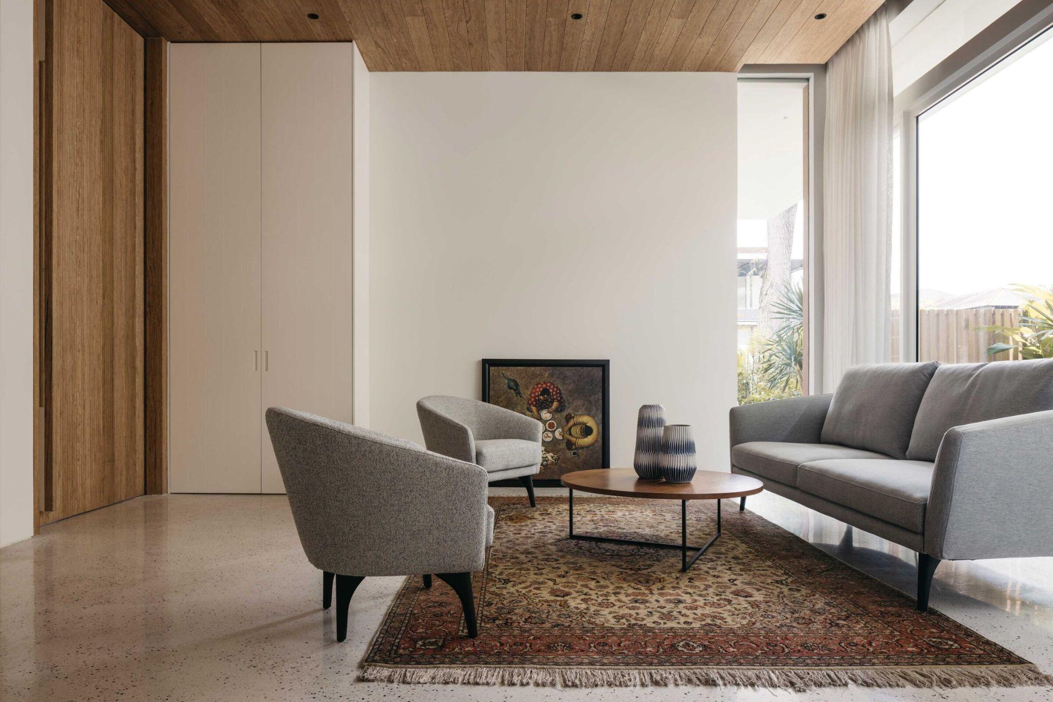 Phòng khách tầng trệt tối giản với sofa xám, ghế bành nỉ và thảm Ba Tư cổ điển, tạo không gian tiếp khách thanh lịch và ấm cúng