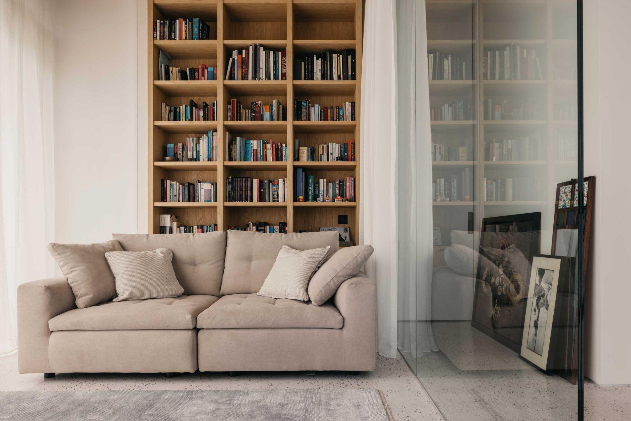 Góc đọc sách yên tĩnh với sofa màu be và kệ sách gỗ sồi cao kịch trần, mang lại cảm giác thư giãn, riêng tư giữa căn nhà hiện đại
