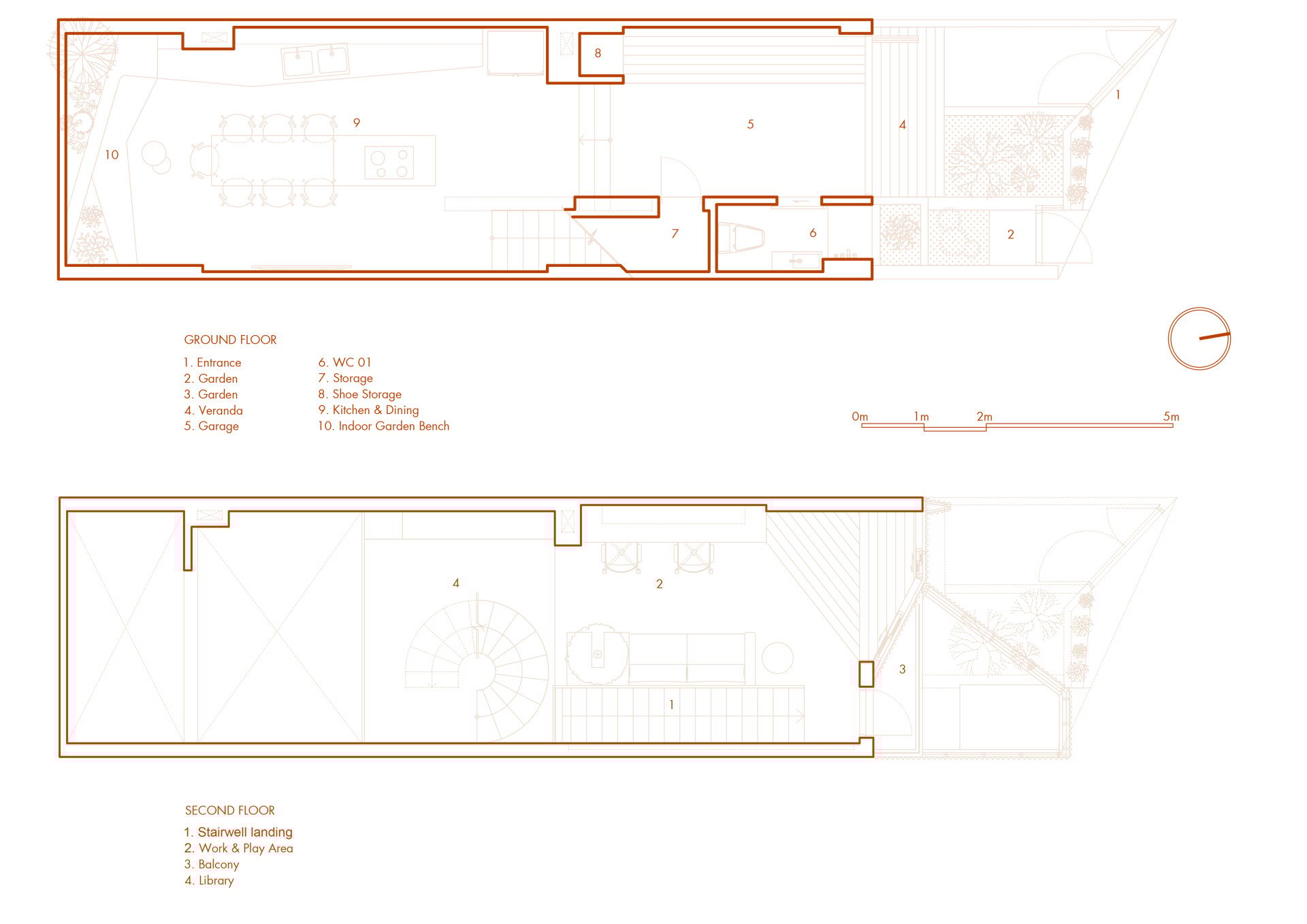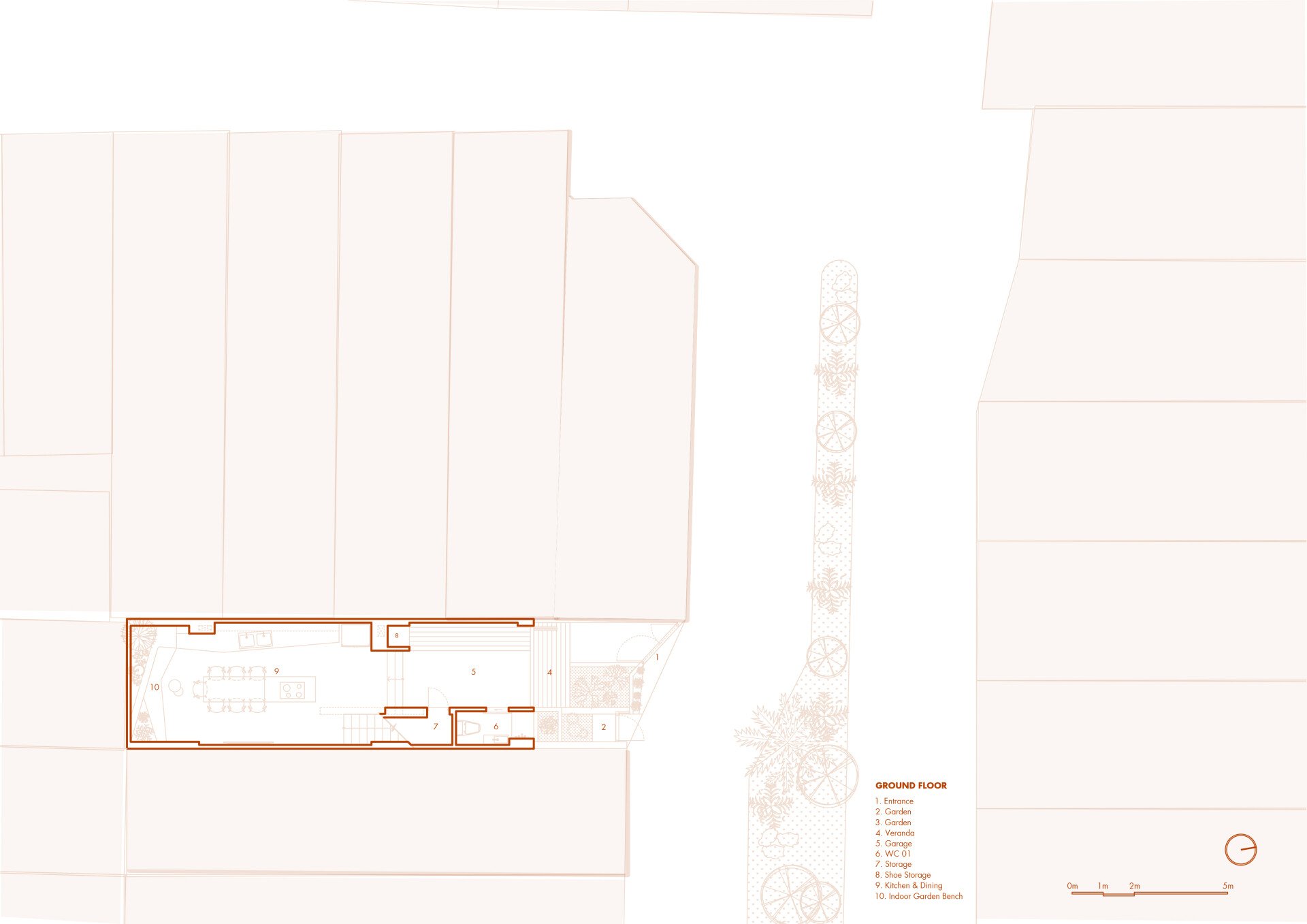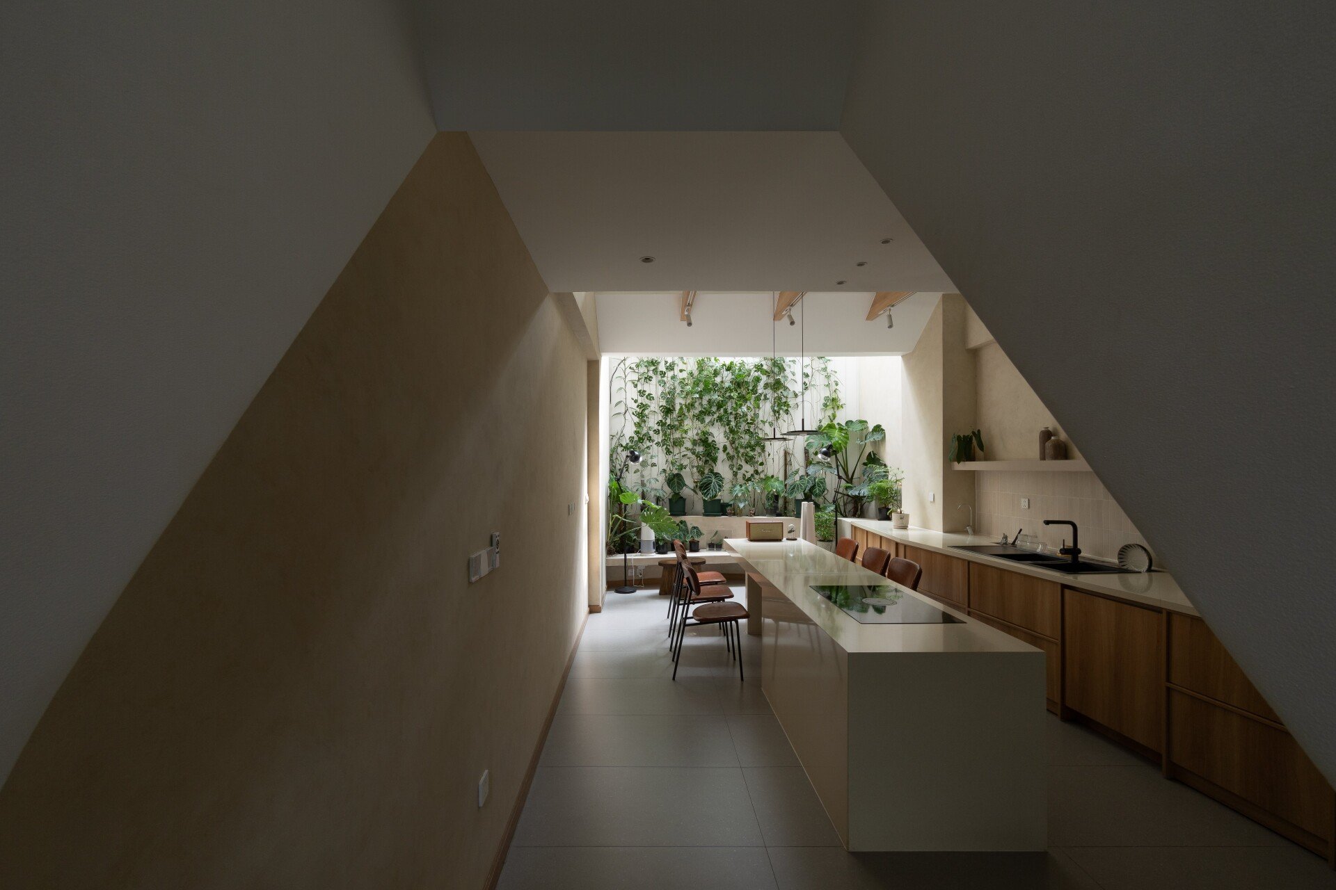 Tầng trệt: Bếp – bàn ăn – chỗ để xe. Phía cuối nhà là khoảng đệm mở kết hợp cây xanh, đưa ánh sáng và gió len sâu vào khu vực nấu nướng. Không gian này vì thế không chỉ để dùng bữa, mà còn là góc tái tạo năng lượng mỗi ngày.